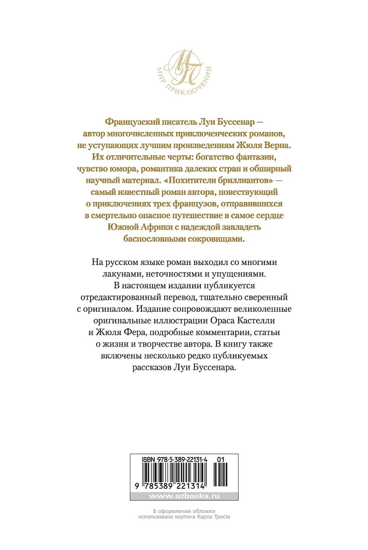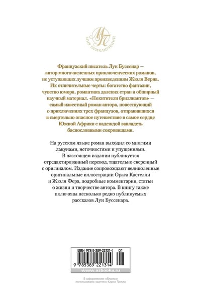 French writer Louis Boussenard is the author of numerous adventure novels, not inferior to the best works of Jules Verne. Their distinctive features: the richness of imagination, a sense of humor, romance of distant lands and extensive scientific material. "Kidnappers of diamonds" - the most famous novel of the author, telling about the adventures of three Frenchmen who went on a deadly dangerous journey into the heart of South Africa with the hope of seizing fabulous treasures. In Russian, the novel came out with many lacunas, inaccuracies and omissions. This edition publishes an edited translation, carefully checked with the original. The edition is accompanied by magnificent original illustrations by Oras Castelli and Jules Fera, detailed commentaries, articles on the life and work of the author. The book also includes several rarely published short stories by Louis Boussenard.