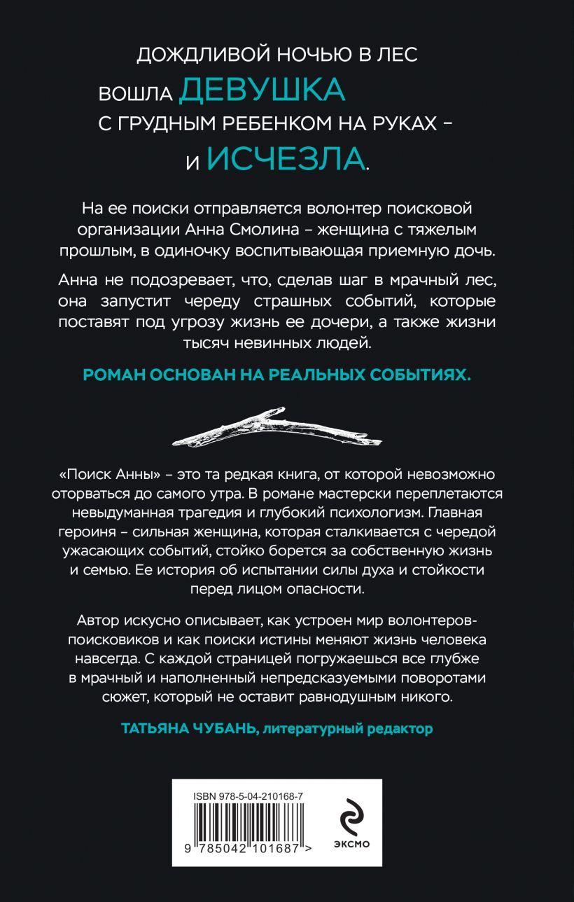"The Search for Anna is a rare book that you cannot tear yourself away from until the morning. The novel skillfully intertwines a true tragedy and deep psychology. The main character is a strong woman who faces a series of horrific events, steadfastly fighting for her own life and family. Her story is about testing fortitude and resilience in the face of danger.