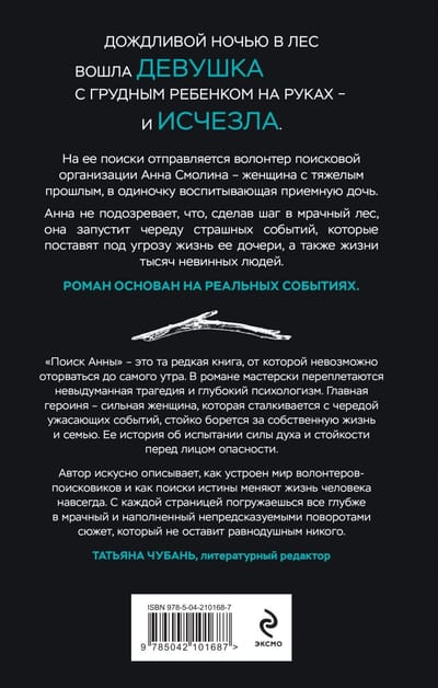The author masterfully describes how the world of volunteer searchers works and how the search for truth changes a person's life forever. With each page you dive deeper into a dark and full of unpredictable twists plot that will not leave anyone indifferent." - Tatyana Chuban, literary editor