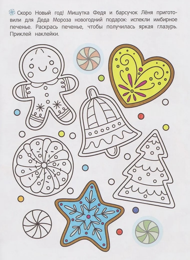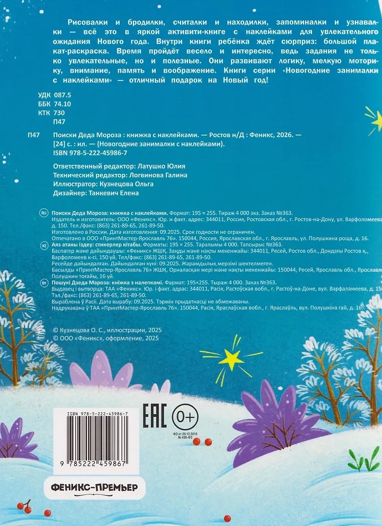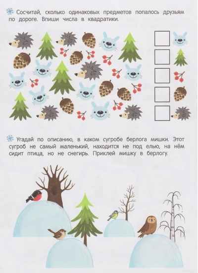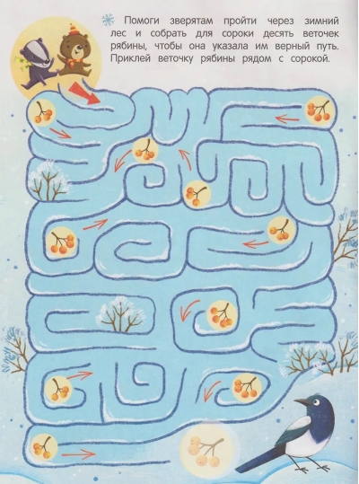 Drawing and walking games, counting and finding games, memory and recognition games—all in a bright activity book with stickers for an exciting New Year's Eve. Inside, a surprise awaits your child: a large coloring poster. Time will pass joyfully and interestingly, as the tasks are not only engaging but also useful. They develop logic, fine motor skills, attention, memory, and imagination.