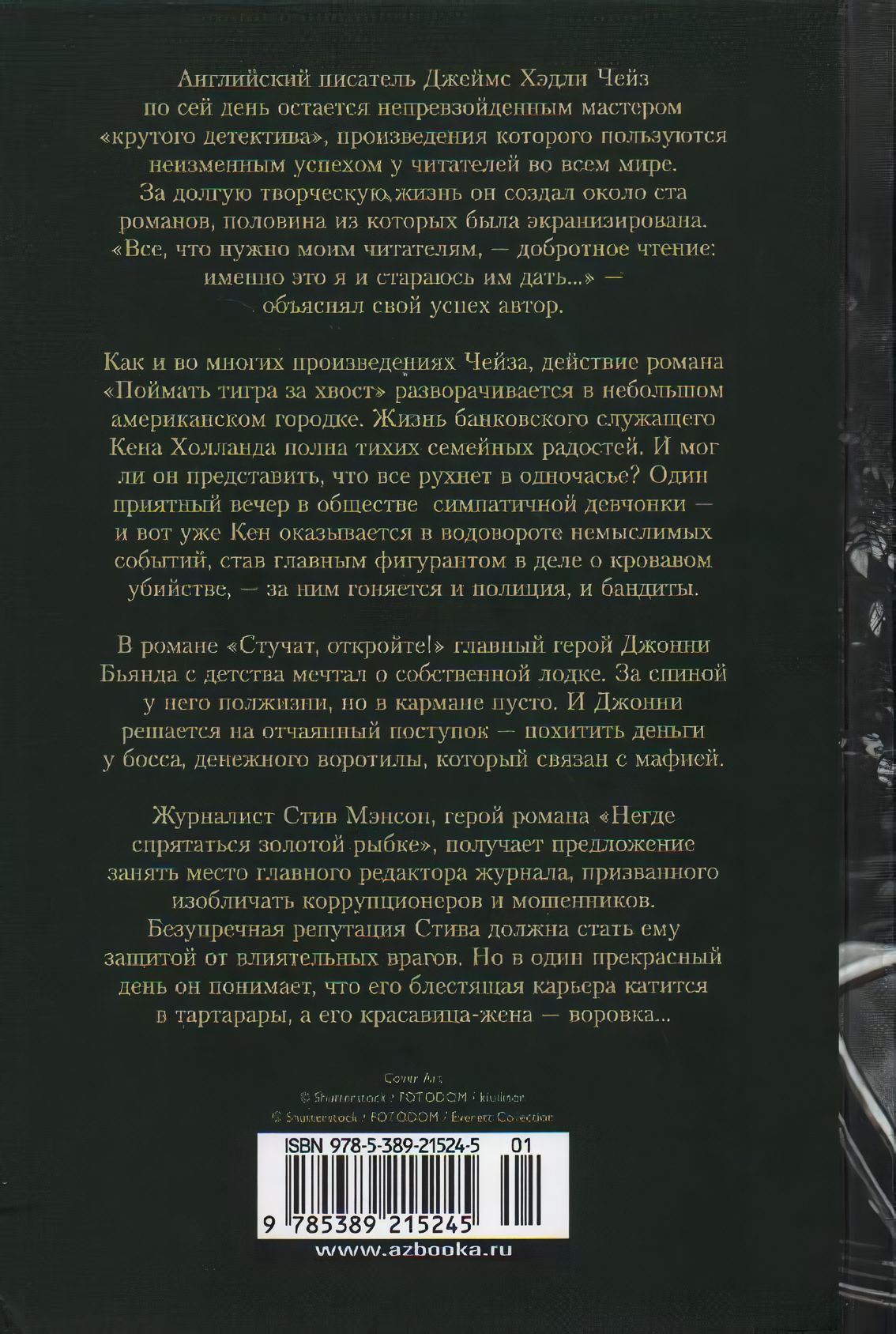 English writer James Hadley Chase to this day remains the unsurpassed master of the "cool detective", whose works enjoy unwavering success with readers around the world. For a long creative life, he created about a hundred novels, half of them were screened. "All that my readers need - good reading: that's what I try to give them..." - the author explained his success. As in many of Chase's works, the action of the novel "To Catch a Tiger by the Tail" unfolds in a small American town. The life of a bank clerk Ken Holland is full of quiet family joys. And could he imagine that all collapse overnight? One pleasant evening in the company of a pretty girl - and now Ken finds himself in a whirlwind of unthinkable events, becoming the main figure in a case of bloody murder - he is chased by the police and gangsters. In the novel "Knock, open the door!" the main character Johnny Byanda since childhood dreamed of his own boat. Behind him, he has half a life, but his pocket is empty. And Johnny decides on a desperate act - to steal money from his boss, a money grubber, who is connected with the mafia. Journalist Steve Manson, the hero of the novel "Nowhere to Hide Goldfish", gets an offer to take the place of editor-in-chief of the magazine, designed to expose corruption and fraud. Steve's impeccable reputation should be his defense against powerful enemies. But one day he realizes that his brilliant career is in tatters, and his beautiful wife is a thief....