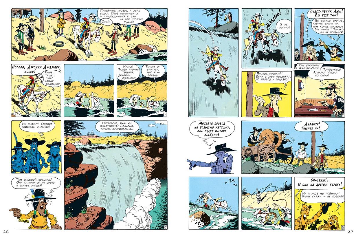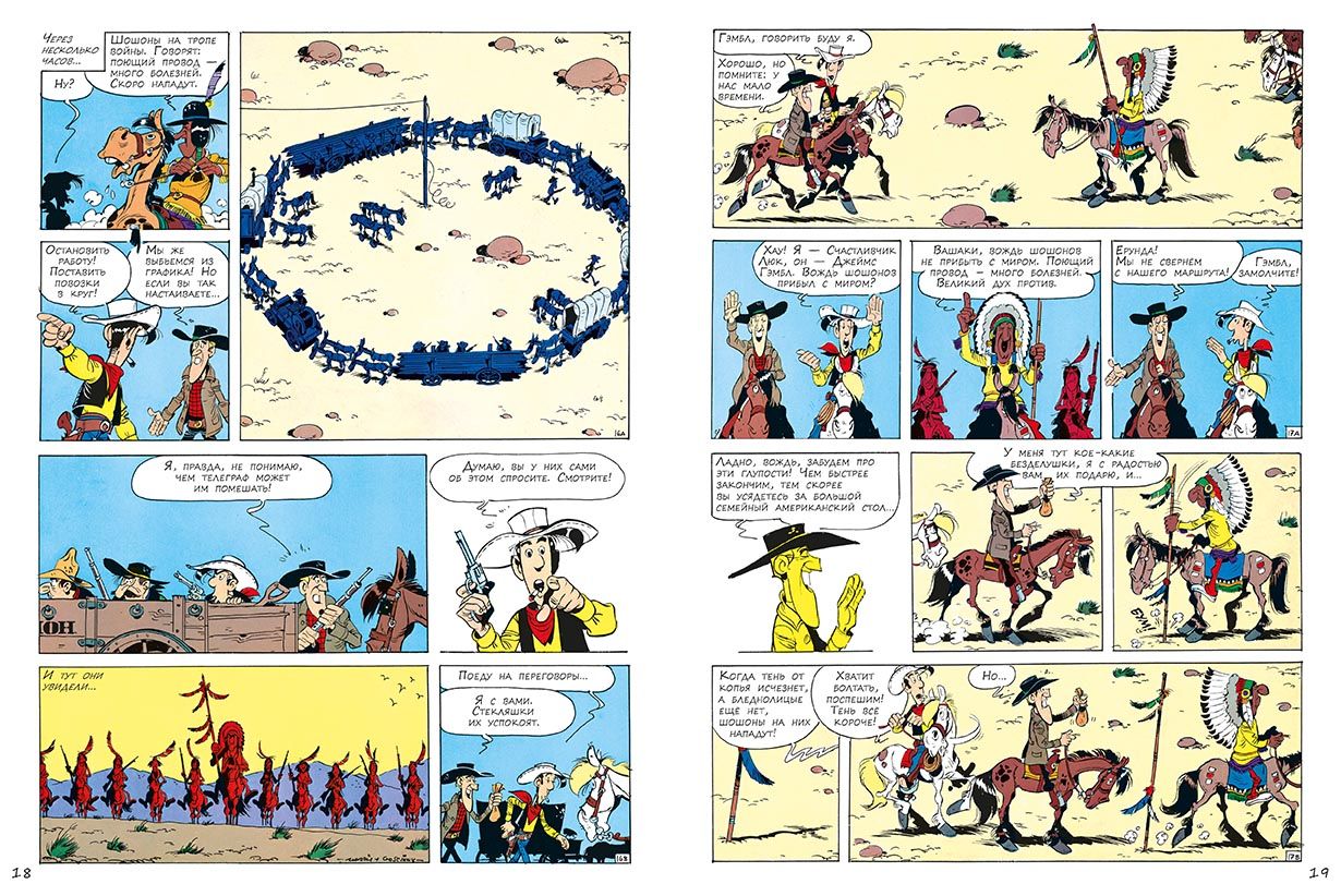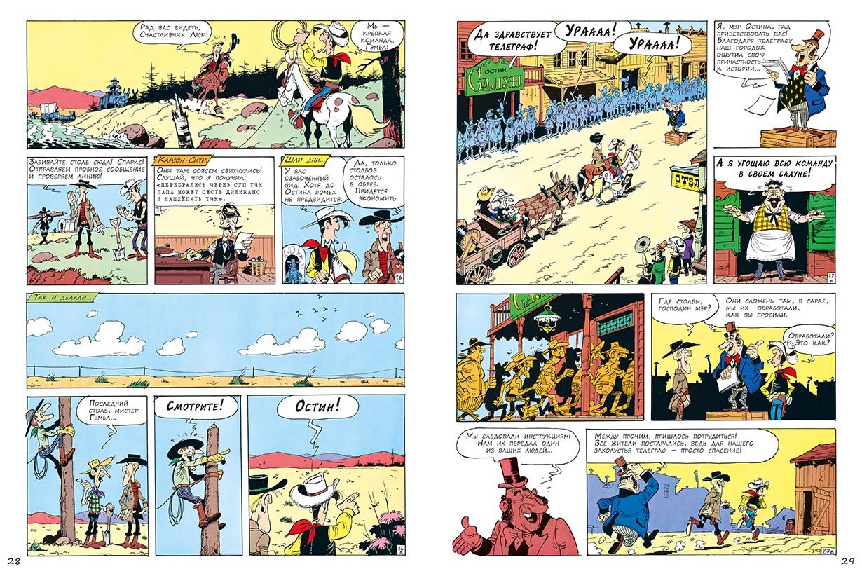 "Lucky Luke," along with "Tintin" and "Asterix," is one of the top three most popular Franco-Belgian comic books in the world. The total number of copies of books in the series has passed 300 million. "Lucky Luke" has already been translated into more than 25 languages, and finally appeared in Russian! Lucky Luke is a charming and fearless lonely cowboy of the times of the conquest of the American Wild West. He is a real hero, and even a superhero, honest and fair, defender of all the weak and helpless. He always stands on the side of the law, helping local authorities to resist bandits and other villains. Like a true superhero, he has his own superpower: to shoot faster than his own shadow! Each Lucky Luke story is a thrilling and highly educational comedy western that reflects real-life events surrounding the exploration of the Wild West. In the seventh book, Luke helps the Western Union Company lay the first transcontinental telegraph line. On the way, the heroes are undergone not only natural dangers, but also hostile Indians. And readers are kept in suspense until the very end of the detective story line: in the team of builders of the telegraph clearly turned traitor. Who is this scoundrel? Comics about Lucky Luke are designed for the widest audience. Both children and older readers will be delighted with the adventurous storyline, virtuoso cartoon drawing, good irony and humor in literally every frame. The humor, based, as a rule, on wordplay and principles of situation comedy, never falls below the belt. And despite the fact that the heroes now and then waving guns and making piffle, in these stories there is neither rudeness nor violence. The protagonist shoots, only to deftly knock the weapon out of the hands of opponents with a skillful shot. And the opponents, naturally, always miss. It is safe to say that not a single character is harmed in any story. Unless you count the bruises and bumps that