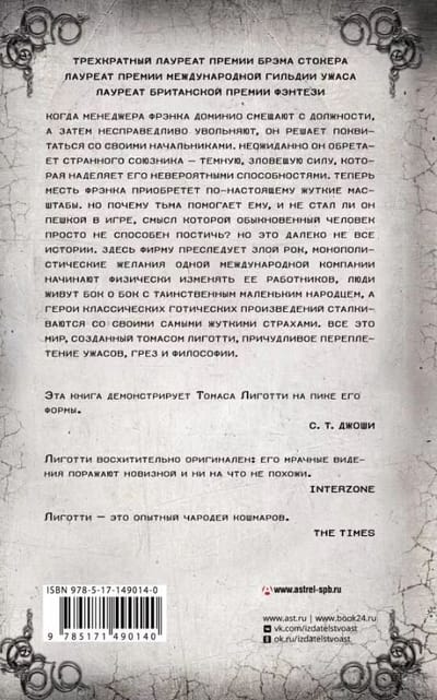 When manager Frank Dominio is removed from his position and then unfairly fired, he decides to get even with his bosses. Unexpectedly, he finds a strange ally - a dark, sinister force that gives him incredible powers. Now Frank's revenge will take on truly terrifying proportions. But why the darkness helps him, and whether he has not become a pawn in the game, the meaning of which ordinary people are simply unable to comprehend? But that's not all the story is about. Here the firm is haunted by evil doom, monopolistic desires of one international company begin to physically change its employees, people live side by side with a mysterious little nation, and the heroes of classic gothic works face their worst fears. All this is the world created by Thomas Ligotti, a bizarre interweaving of horror, dreams, and philosophy.