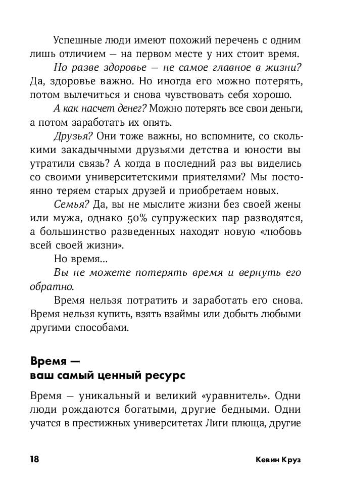 Before you is a book about time management..... without time management! It turns out that really successful people in their lives do not use the techniques that are traditionally talked about by time management experts. Kevin Kruse specifically studied the habits of several thousand professionals, but never found any correlation between time management training and productivity, stress reduction or a sense of happiness.
