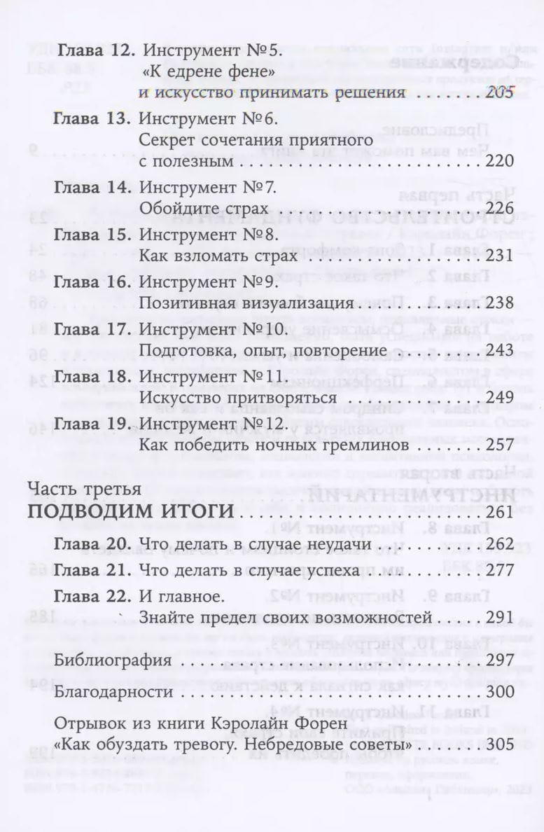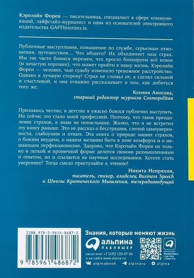 Anxiety, internalized complexes, repressed fears - all of these prevent us from living life to the fullest, from being successful at work and in our personal lives. Simple tools and exercises developed by Caroline Foren, a communications specialist, will help us get rid of them. Many people will recognize themselves in the examples in the book: fear of public speaking, excessive perfectionism, imposter syndrome and many other problems of modern man. Based on her own experience and the results of modern research in the fields of physiology, sociology and cognitive psychology, Caroline Foren explains how to cope with this or that problem. Her book has helped thousands of people around the world to overcome insecurity, believe in themselves, and realize their full potential without regard to other people's opinions.