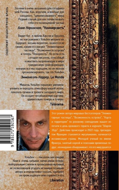 Brilliant and unpredictable Michel Houellebecq is one of the most famous writers on the planet, the author of the world bestsellers "Elementary Particles", "Platform", "The Possibility of an Island", "Map and Territory" (Goncourt Prize 2010). His sixth novel "Submission" by fateful coincidence hit the shelves on the day of the bloody terrorist attack in the magazine "Charlie Hebdo", which dedicated an issue to the release of this book. "Submission" tells of the collapse in the not-too-distant future of France's modern political system. Houellebecq himself defined the genre of his novel as "political fiction". The action unfolds in 2022. A Muslim president comes to power democratically, and the country begins to change before his eyes. A lonely intellectual named François, absorbed in science, university intrigue and the search for temporary girlfriends, suddenly finds that his world is collapsing like a house of cards.
