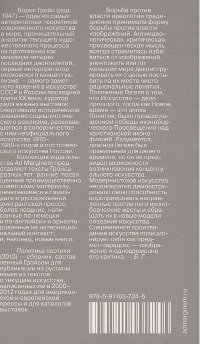 The Politics of Poetics (2013) is a collection compiled by Groys for publication in Russian from texts on current art he wrote in 2000-2012 for the American and European press and for exhibition catalogs.