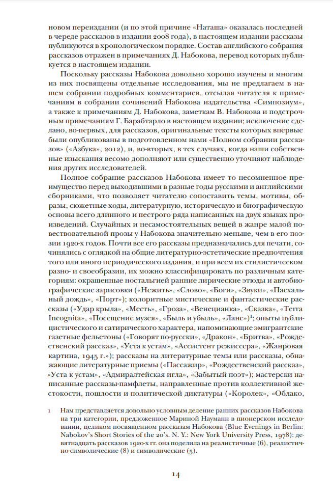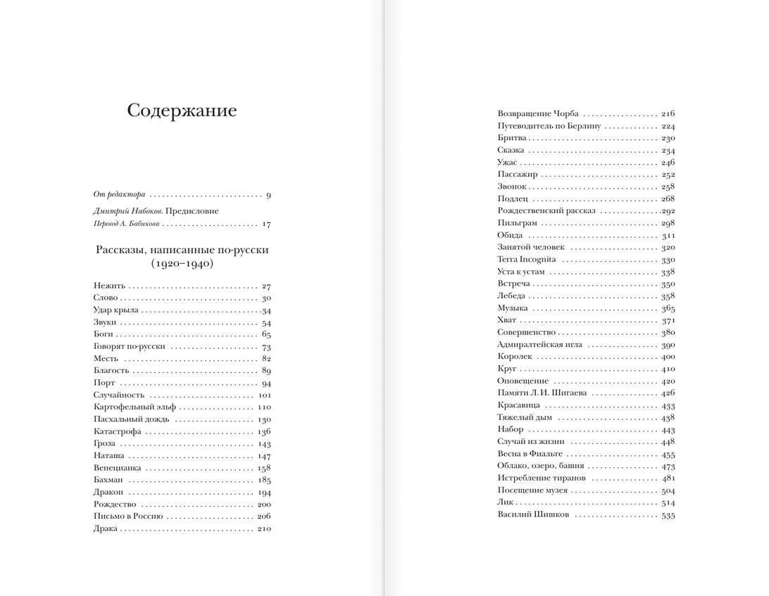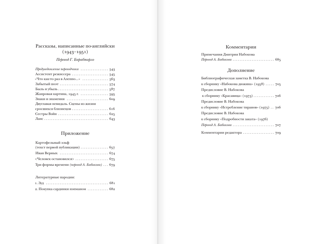 The English collection of short prose by Vladimir Nabokov (1899-1977), published by the writer's son in 1995, is well known in the West. However, in Russian, the language in which Nabokov wrote most of his short stories, the book has not been published for a long time. Thanks to years of work by researchers, the volume compiled by Dmitry Nabokov was supplemented with new works, and as a result, by 2008 it was possible to collect under one cover more than sixty stories written by Nabokov in 1920-1951 in European exile and in America. In addition to well-known works, this complete collection of short stories includes rare early writings as well as Nabokov's prefaces and notes from English collections. The Appendix contains works not included in previous collections of short stories. The edition is provided with a foreword and notes by D. Nabokov. The reader will also find a significant body of information in the comments by the editor and compiler of the collection, Andrei Babikov. The English stories are printed in the translation by Gennady Barabtarlo, prepared with the participation of Vera Nabokova.