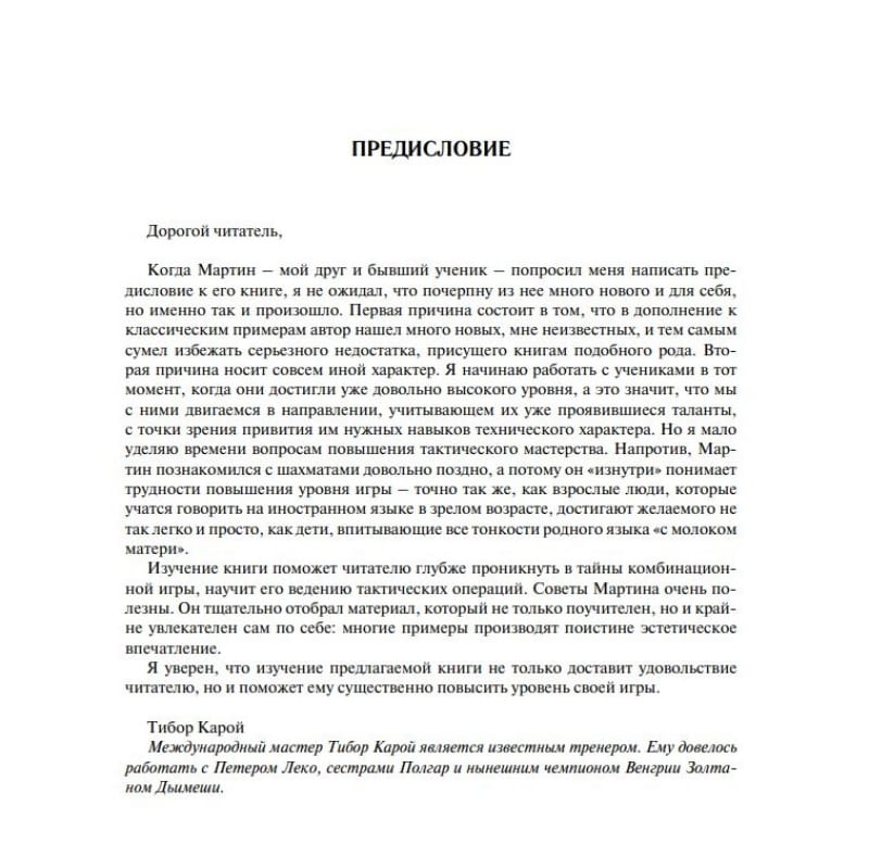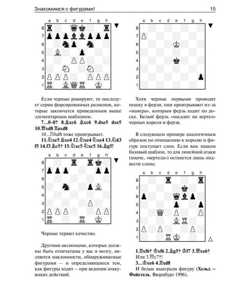 This book, which has been recognized in Europe, finally comes to the Russian-speaking reader. Addressing chess players of mass grades, the author teaches not only how to strike effective blows in positions ripe for it, but also how to recognize motives in advance and create the prerequisites for combinations. The examples are chosen with excellent taste and are overwhelmingly not among those that are swarming from textbook to textbook. A large number of diagrams and the brevity of the fragments analyzed make the book easy to read without a board, which also contributes to the development of combinational vision. For a wide range of chess fans.
