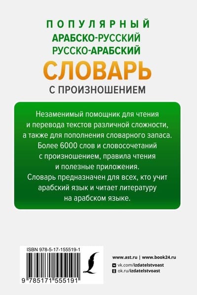 "Popular Arabic-Russian-Russian-Arabic dictionary with pronunciation" contains more than 6000 words and word combinations with pronunciation, reading rules and useful applications. This edition will become an indispensable assistant for reading and translating texts of various complexity, as well as for enriching your vocabulary.