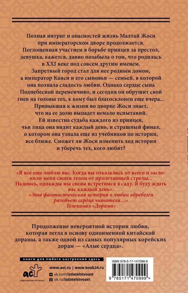 Maltai Ruoxi's life at the imperial court, full of intrigue and danger, continues. Absorbed in the princes' struggle for the throne, the girl seems to have long forgotten that she was born in the 21st century under a completely different name. The Forbidden City has become her home, and Emperor Kangxi and his sons—the family in which she learned the sweetness of love. However, the heart of the son of the Celestial Empire is fickle, and today he will unleash his wrath on those he favored only yesterday...