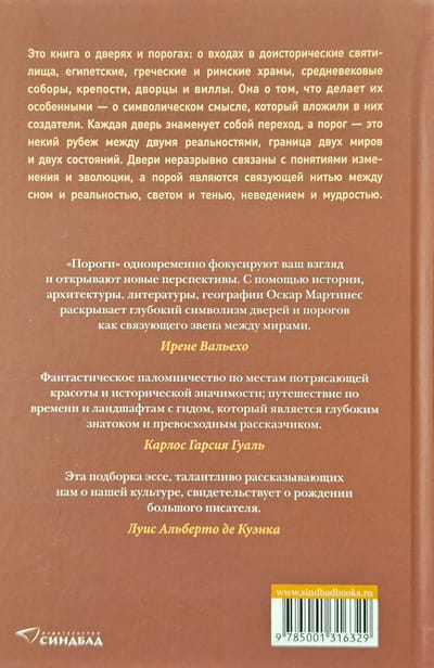 In the essay book Thresholds, Oscar Martinez takes readers on a fascinating journey full of stories and observations: from the House of the Vettii in Pompeii to the Dolmen of Menga and the Abbey of Sainte-Foy. The author talks about the Fouquet jewelry store in Paris, the Bauhaus building in Dessau, the Güell estate in Barcelona, the Castel Nuovo castle in Naples, the Regaleira estate in Portugal and the Secession House in Vienna.