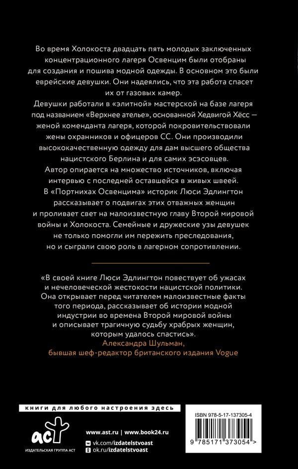 During the Holocaust, twenty-five young inmates of the Auschwitz concentration camp were selected to design and sew fashionable clothing. They were mostly Jewish girls. They hoped that this work would save them from the gas chambers. The girls worked in an "elite" workshop at the camp base called the Upper Atelier, founded by Hedwiga Hoess, the wife of the camp commandant, who was patronized by the wives of SS guards and officers. They produced high quality clothing for the ladies of high society in Nazi Berlin and for the SS themselves. In The Tailors of Auschwitz, historian Lucy Adlington recounts the exploits of these brave women and sheds light on a little-known chapter of World War II and the Holocaust. The girls' family and friendship bonds not only helped them survive persecution, but also played a role in camp resistance. The author draws on many sources, including interviews with the last surviving seamstress.