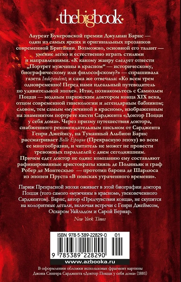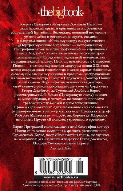 Booker Prize winner Julian Barnes is one of the most brilliant and original writers of modern Britain, the author of such international bestsellers as One Story, The Noise of Time, The Sense of an Ending, Arthur and George, A History of the World in 10½ Chapters, Flaubert's Parrot, Elizabeth Finch and many others. Perhaps his main talent is the ability to easily and naturally play with styles and directions. Subtle stylization and caustic irony, refined lyricism and sarcasm bordering on cynicism, aggressive harshness and cheerful mischief - Barnes is master of all this and much more. "To what genre should The Portrait of a Man in Red be attributed - historical, biographical or philosophical?" asked the Independent newspaper; and it itself answered: "To all three at once! Before us is the perfect guide to an amazing era." So, meet Samuel Pozzi, a fashionable Parisian doctor of the late 19th century, the father of modern gynecology and a legendary womanizer; in a word, the same “man in red” depicted in Sargent’s famous portrait “Doctor Pozzi at Home”. Through the prism of the doctor’s journey to Foggy Albion, equipped with a letter of recommendation from Sargent to Henry James, Barnes examines the Belle Époque in all its diversity, and the reader cannot help but draw alarming parallels with today. And the doctor is not traveling alone: he is accompanied by refined aristocrats Prince de Polignac and Count Robert de Montesquiou, the prototype of Baron de Charlus from Proust’s epic “In Search of Lost Time”.