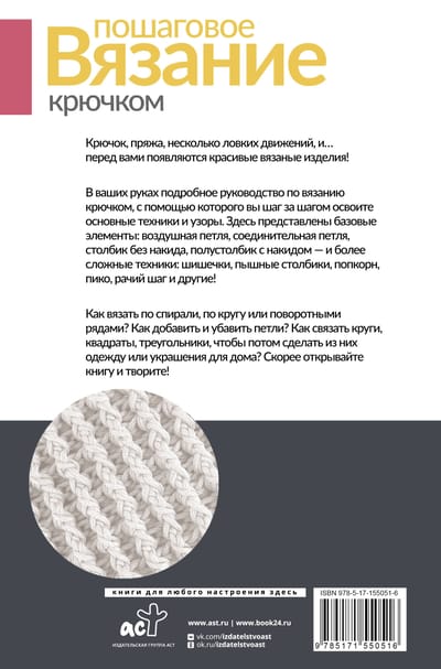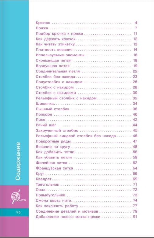 This book is a detailed guide to crocheting, with which you will learn the basic techniques step by step: from knitting loops to connecting patterns into finished products. You will learn how to knit motifs, turn rows, how to add and reduce loops, complete work and more.
