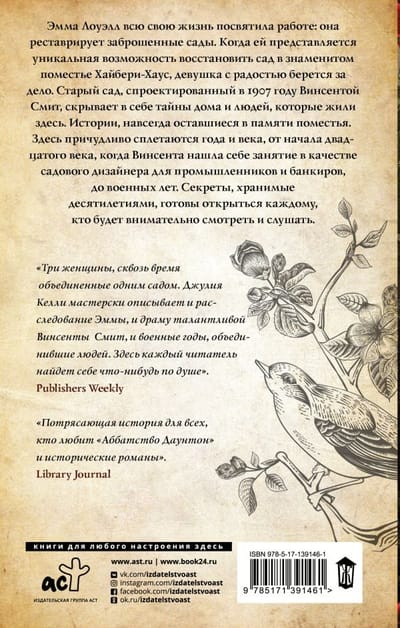 Emma Lowell has spent her whole life working: she restores abandoned gardens. When she is presented with a unique opportunity to restore the garden at the famous Highbury House estate, she is delighted to take on the task. The old garden, designed in 1907 by Vincent Smith, hides the secrets of the house and the people who lived there. Stories that are forever etched in the memory of the estate. Years and centuries are intricately woven together here, from the early twentieth century, when Vincenta found employment as a garden designer for industrialists and bankers, to the war years. Secrets kept for decades are ready to be revealed to anyone who will watch and listen carefully.