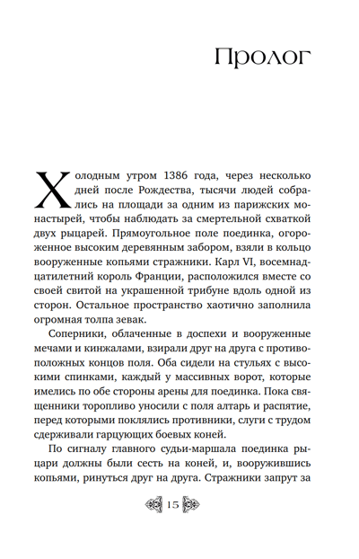 The court is stumped and orders a duel between Carrouges and Le Gris, the outcome of which will also decide Marguerite's fate. If her husband loses, she is to be burned for false accusations. The duelists will fight until one kills the other.