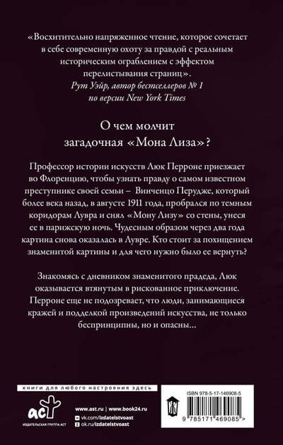 What is the mysterious "Mona Lisa" silent about? Professor of art history Luc Perrone comes to Florence to learn the truth about the most famous criminal of his family - Vincenzo Perugia, who more than a century ago, in August 1911, snuck through the dark corridors of the Louvre and removed the "Mona Lisa" from the wall, taking it into the Parisian night. Miraculously, two years later, the painting was back in the Louvre. Who is behind the kidnapping of the famous painting and why was it necessary to return it? Familiarizing himself with the diary of his famous great-grandfather, Luke finds himself drawn into a risky adventure. Perrone does not yet suspect that people engaged in theft and forgery of works of art, not only unscrupulous, but also dangerous ...