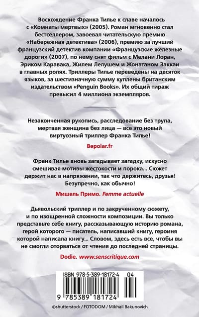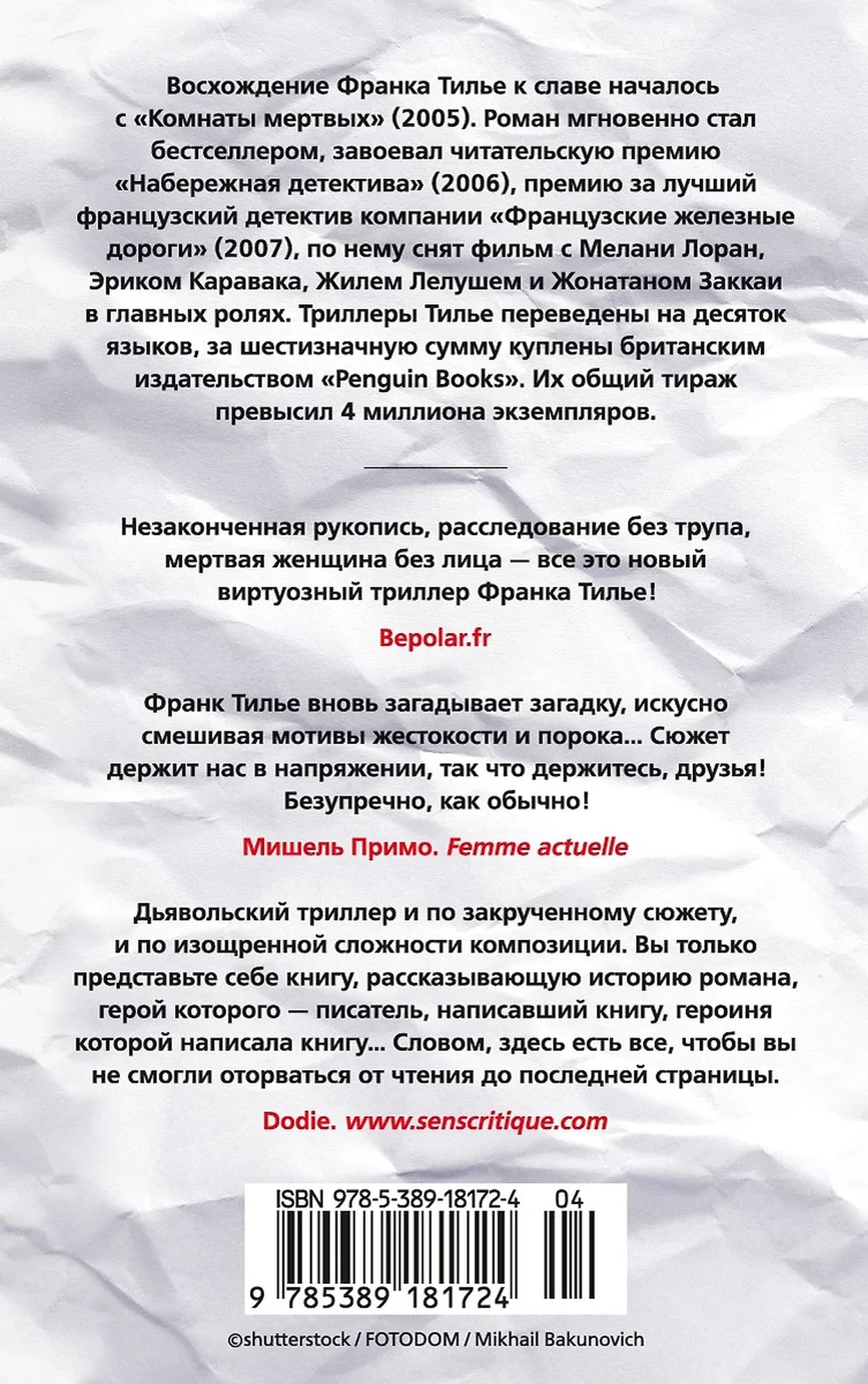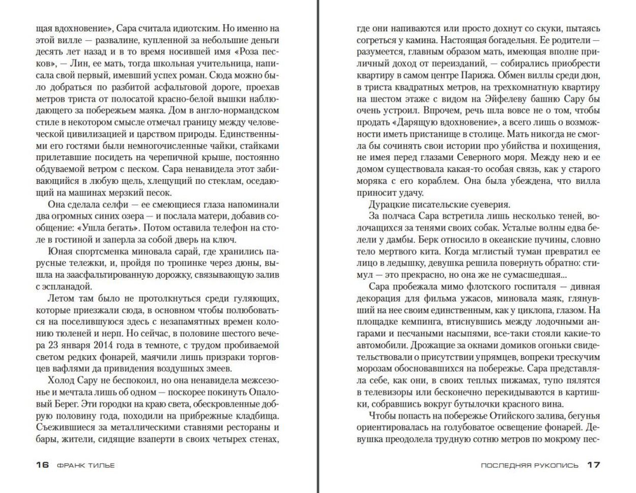 A road accident near Grenoble: a young man driving away from customs inspectors crashed his car into a parapet and died. When police arrived, they found the girl's body in the trunk. Without a face. So begins Frank Tillier's new novel "The Last Manuscript", reminiscent of a cleverly chiseled matryoshka doll, where one mystery replaces another. The main line is connected with Lin Morgan: the modest teacher turned thriller queen has always kept her personal life a secret, but this former life - quiet, happy - turned to ashes with the disappearance of her seventeen-year-old daughter. Lin is forced to leave the beautiful villa on the Opal Coast, to part with her husband. But four years later, a phone call rings and she is informed that her husband is in hospital. Moreover, after the attack on him, he lost his memory....