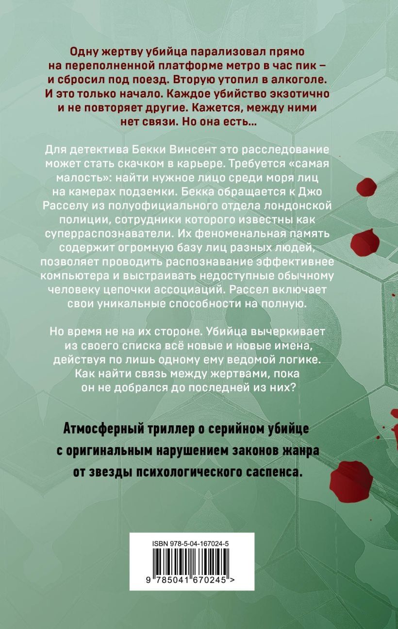 There are no coincidences in my world. Only carefully constructed scenarios... One victim was paralyzed by the killer right on a crowded subway platform during rush hour - and thrown under a train. The other drowned in alcohol. And that's just the beginning. Each murder is exotic and unlike the others. There seems to be no connection between them. But there is... For Detective Becky Vincent, this investigation could be a career leap. It takes "the smallest of things": finding the right face among a sea of faces on the subway cameras. Becca turns to Joe Russell of the semi-official London Police Department, whose officers are known as super-recognizers. Their phenomenal memory contains a huge database of faces of different people, allows to conduct recognition more efficiently than a computer and build inaccessible to the average person chains of associations. Russell turns his unique abilities on full blast. But time is not on their side. The killer crosses off more and more names from his list, acting on a logic he alone knows. How to find the connection between the victims before he gets to the last of them? An atmospheric thriller about a serial killer with an original violation of the laws of the genre from the star of psychological suspense.