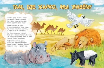 Animals are amazing creatures. They adapt to any climate. They are not frightened by strong storms, icy water, cold nights or the scorching desert sun. Kseniya Valakhanovich and Olga Sall in funny poems and mischievous drawings told how animals and birds live in the hottest and coldest corners of our planet.