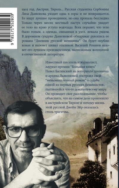 1902. Austria. Tyrol ... Russian Sorbonne student Liza Diakonova goes alone into the mountains and does not return. The best guides search for her, but she disappears without a trace. Only a month later, a local shepherd accidentally sees her body on the edge of a waterfall ledge. It will strike everyone that the body was naked, with her clothes tied in a knot lying nearby. In Diakonova's traveling trunk, the manuscript of her novel, Diary of a Russian Woman, will be discovered. It will be published and will cause a flurry of responses. Vasily Rozanov will call it the best work written by a woman in Russian literature.