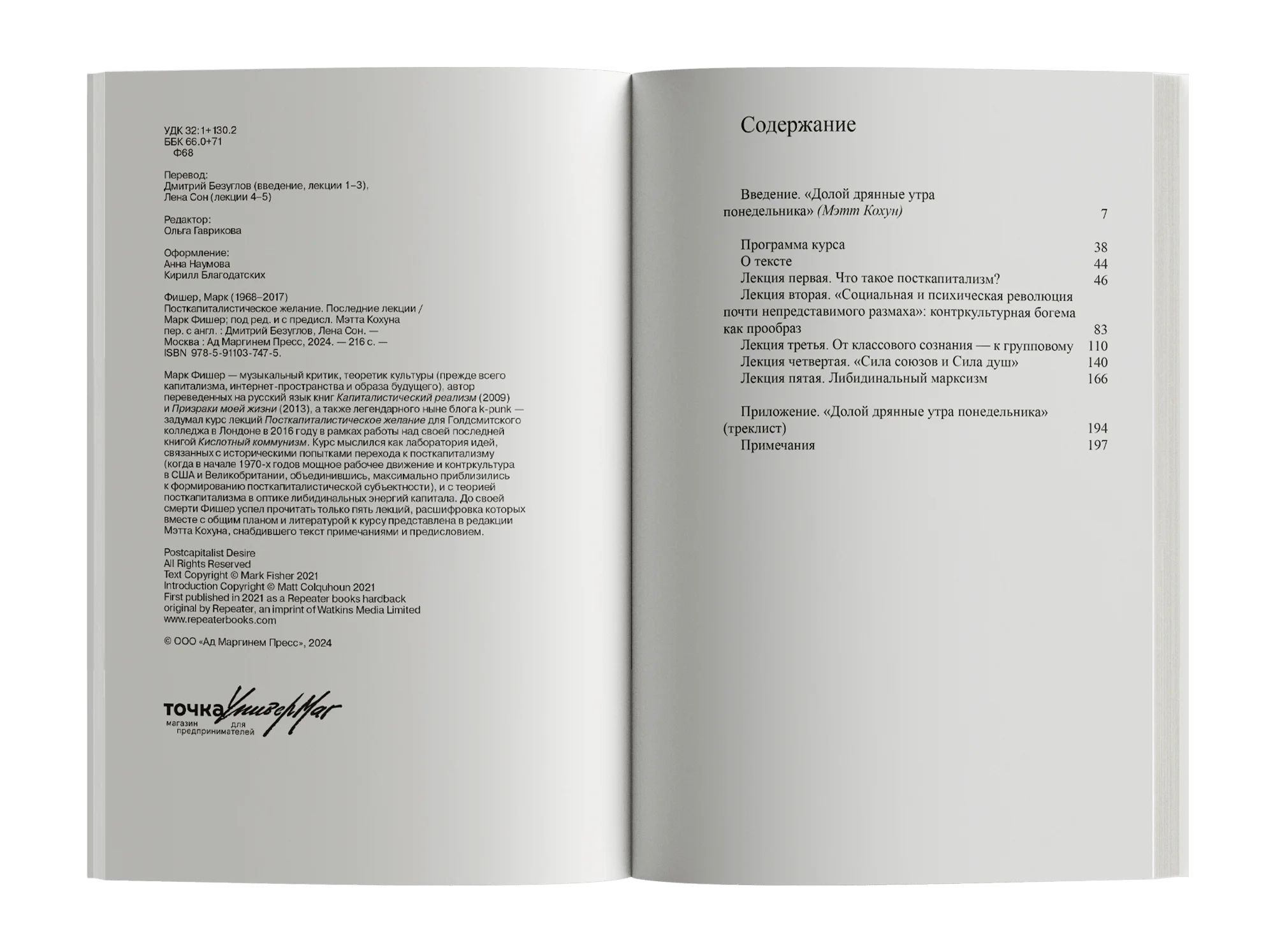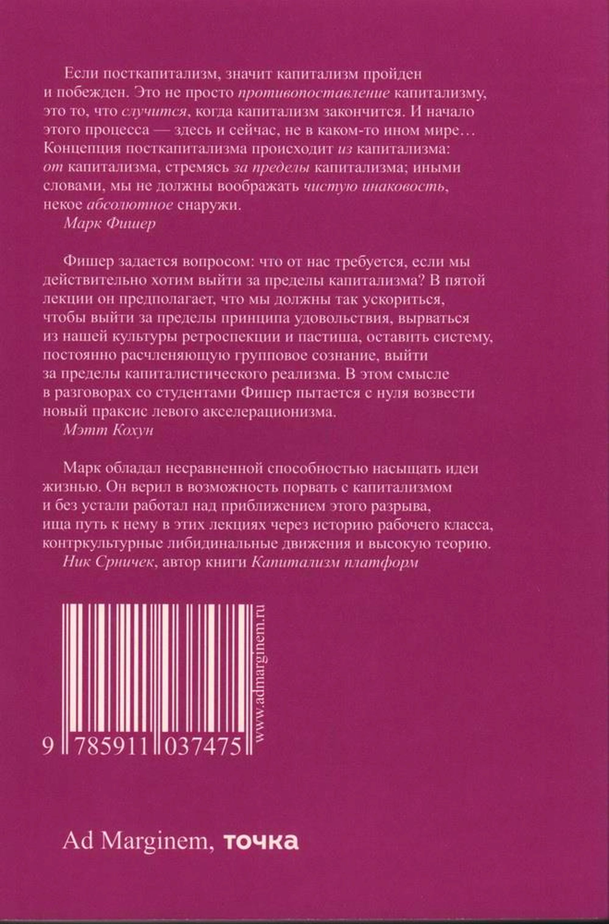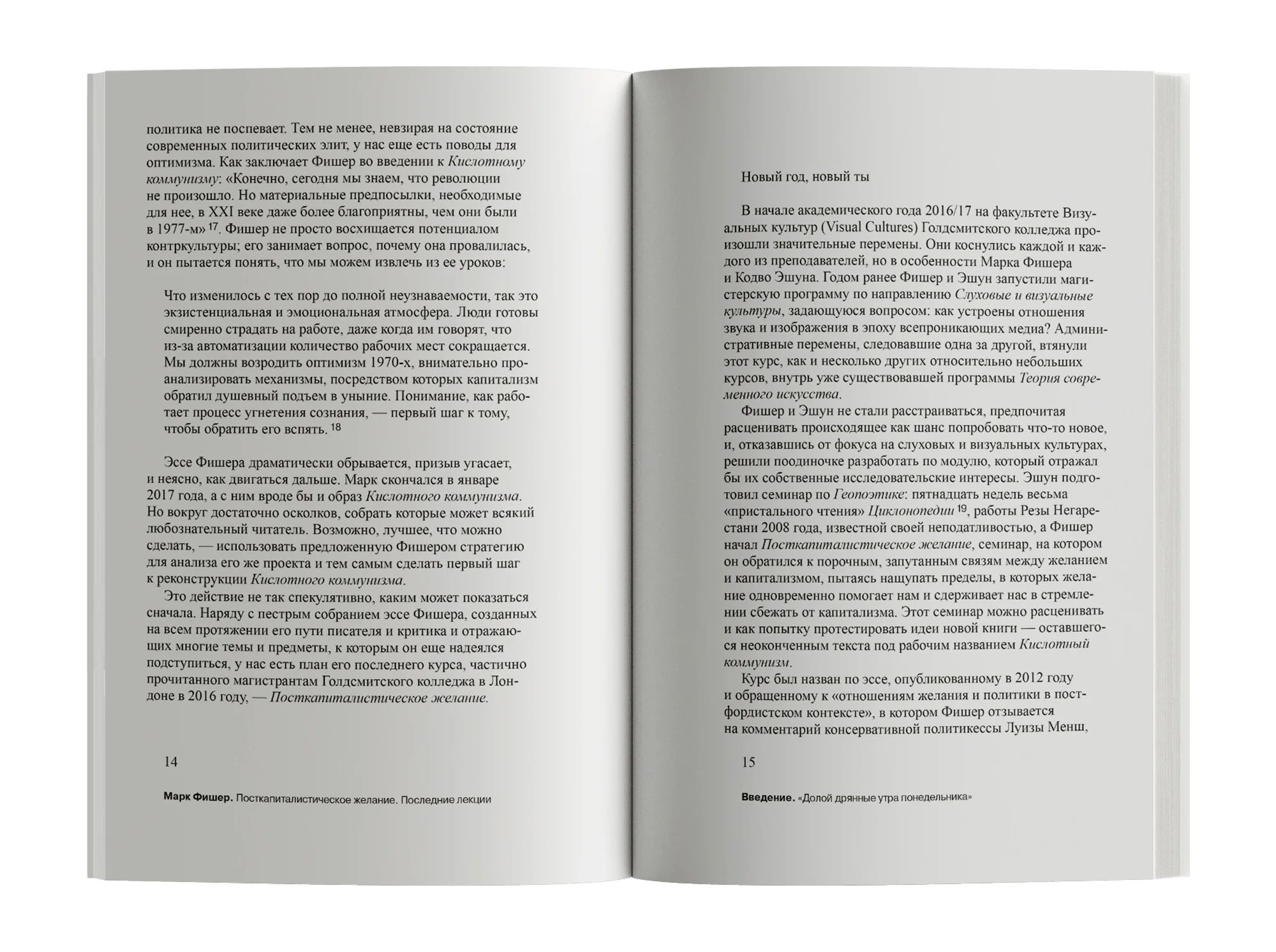 A collection of the final lecture series by the British philosopher, cultural theorist, publisher and activist Mark Fisher (1968-2017), delivered at Goldsmiths College, University of London in 2016. Beginning with the most fundamental of questions, ‘Do we really want what we say we want?’, Fisher explores the relationship between desire and capitalism, and seeks to understand what new forms of desire we might still draw from the past, present and future. From the rise and failure of the counterculture in the 1970s to the subsequent development of his left-wing accelerationist line of thought, this book presents a tragically interrupted course of reflection on the cultivation of a new kind of consciousness and its cultural consequences.