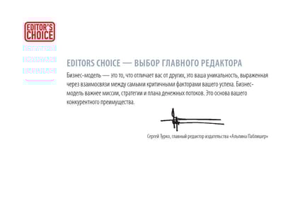 The authors offer a simple and clear way to visually present the main basic elements that reveal the logic of the company's chosen method of making a profit. A large sheet of paper and a block of stickers - that's all you need to master the author's method of creating business models. This intentionally simplified approach allows you to get a general strategic picture of the business, minimizing the discussion of specific tactical steps. Using stickers with short formulations is an effective and quick way to build the basic elements of a business plan into a holistic system. This technique helps to imagine the work of the organization as a single whole, and not a set of separate functional units and production operations.
