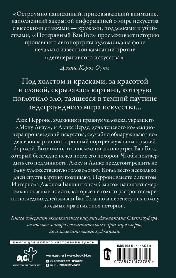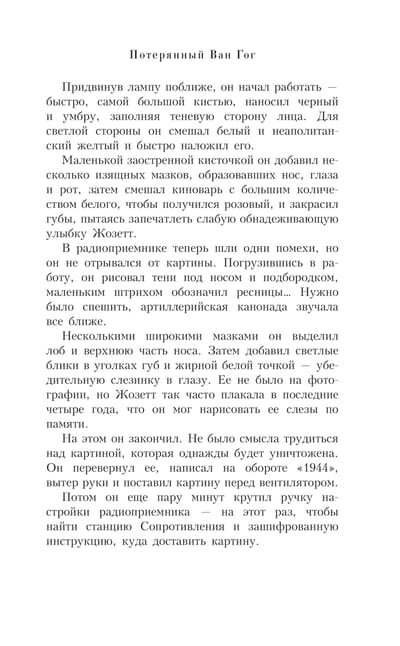 Luc Perrone, artist and great-grandson of the man who stole the Mona Lisa, and Alix Verde, daughter of a shady art collector, accidentally discover underneath the cheap painting an ancient portrait of a man with a red beard. It may be Van Gogh's last self-portrait, which disappeared without a trace after his funeral. To confirm its authenticity, Luke and Alix have more than one artistic puzzle to solve. When the painting is stolen just days later, Perrone, along with Interpol agent John Washington Smith, embarks on a deadly search that will not only uncover the secrets of Van Gogh's final days, but also transport them to one of history's darkest eras....