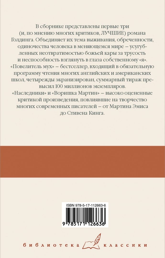 "Lord of the Flies" - a bestseller, included in the compulsory reading program of many English and American schools, four times screened, the total circulation exceeded 100 million copies. "The Heirs" and "Thief Martin" - critically acclaimed works that have influenced the work of many modern writers - from Martin Amis to Stephen King.