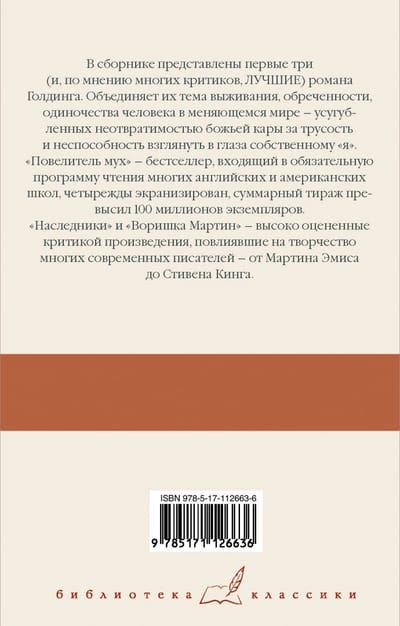 The collection presents Golding's first three (and, according to many critics, the best) novels. What unites them is the theme of survival, doom, and the loneliness of man in a changing world - exacerbated by the inevitability of God's punishment for cowardice and the inability to look his own self in the eye.
