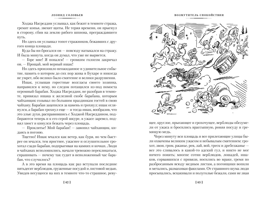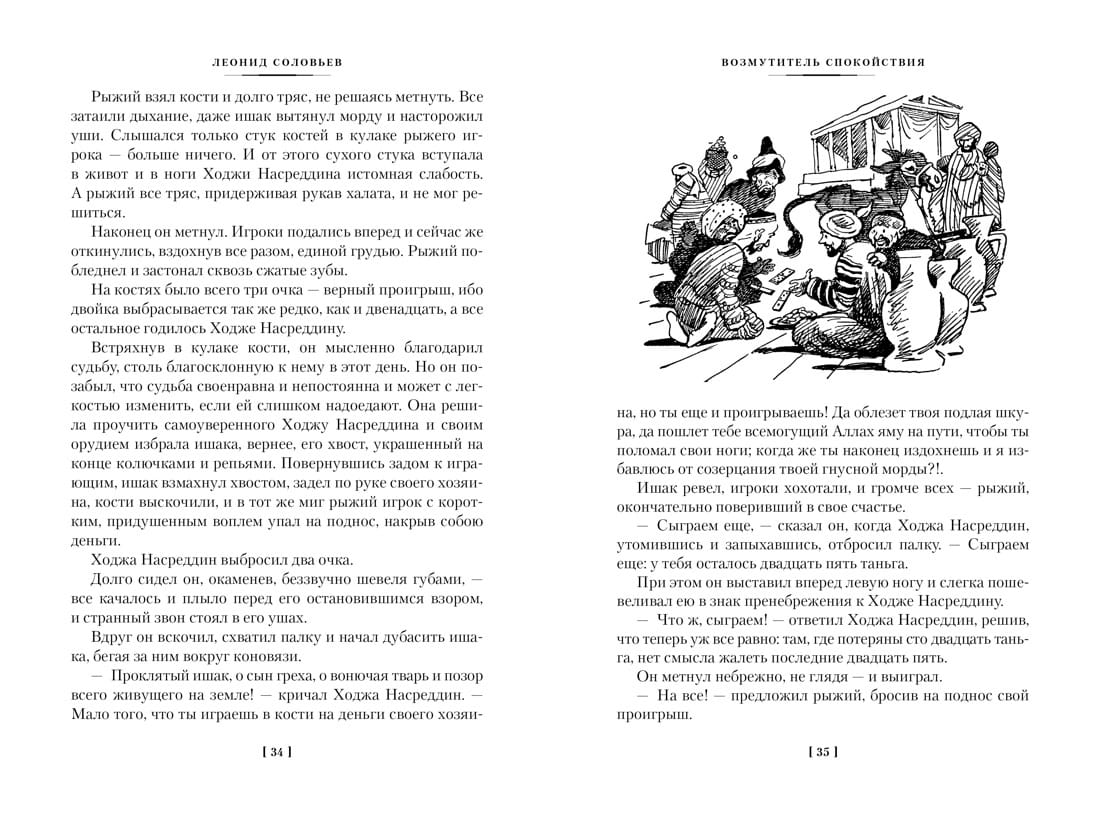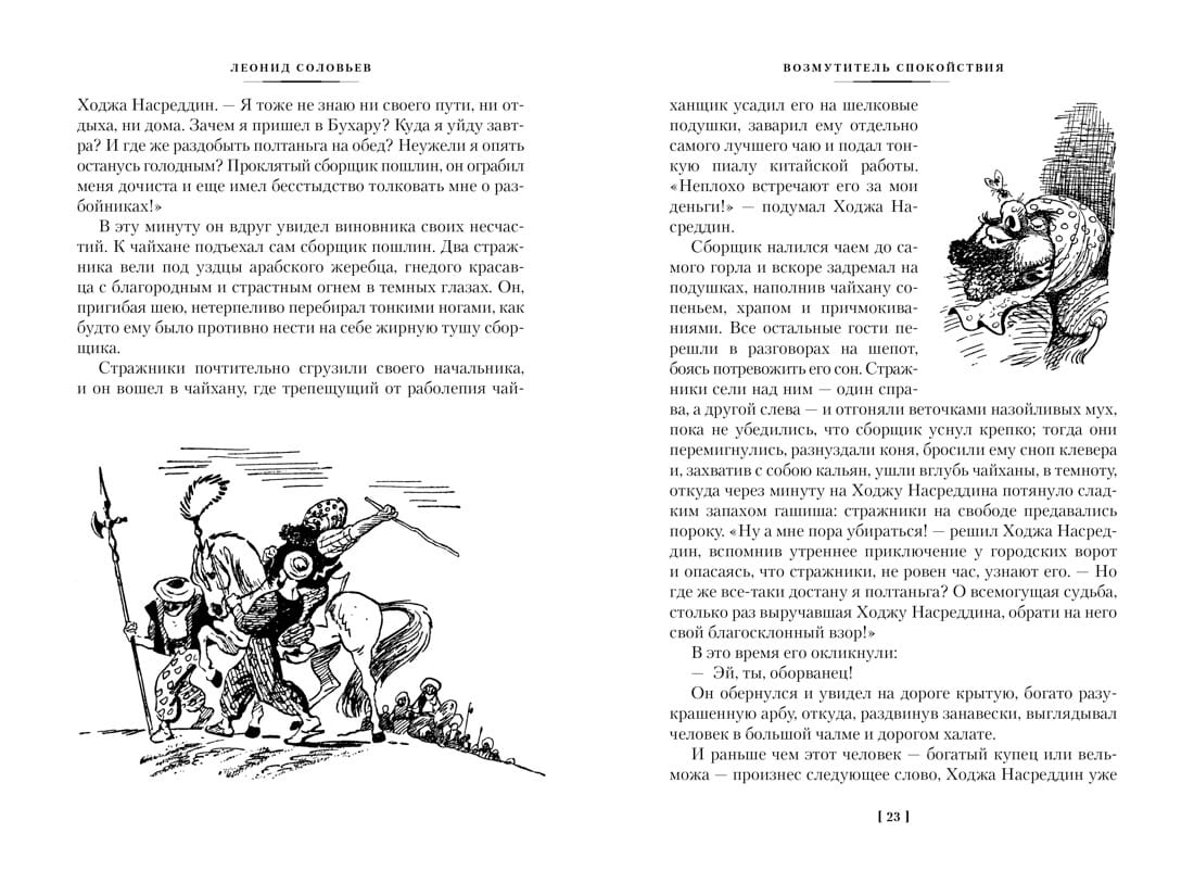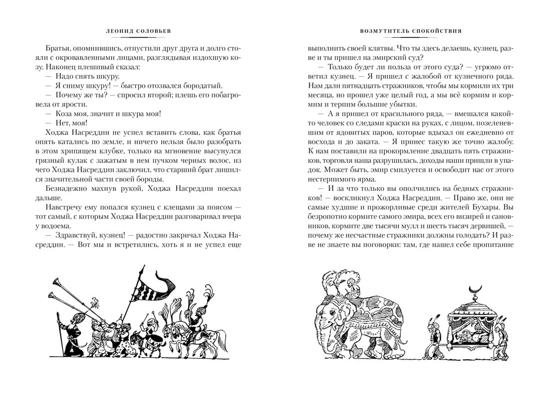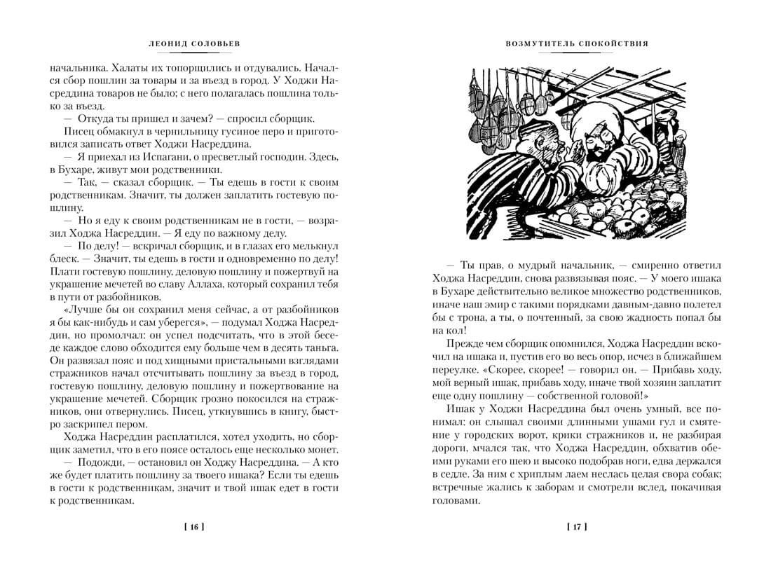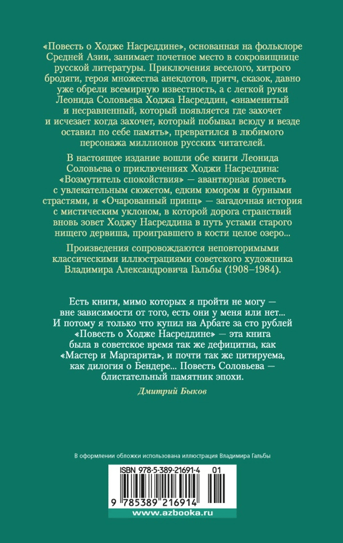 "The Tale of Khoja Nasreddin", based on the folklore of Central Asia, occupies an honorable place in the treasury of Russian literature. The adventures of the cheerful, cunning vagabond, the hero of many anecdotes, parables, fairy tales, have long since gained worldwide fame, and with Leonid Soloviev's easy hand, Khoja Nasreddin, "famous and incomparable, who appears wherever he wants and disappears whenever he wants, who has been everywhere and left a memory everywhere", has become a favorite character of millions of Russian readers. This edition includes both books by Leonid Soloviev on the adventures of Khoja Nasreddin: "Disturber of Tranquility" - an adventurous tale with a fascinating plot, caustic humor and violent passions, and "The Enchanted Prince" - a mysterious story with a mystical bent, in which the road of wanderings again calls Khoja Nasreddin on the road through the lips of an old beggar dervish, lost in the dice a whole lake ... The works are accompanied by unique classic illustrations by Soviet artist Vladimir Alexandrovich Galba (1908-1984).