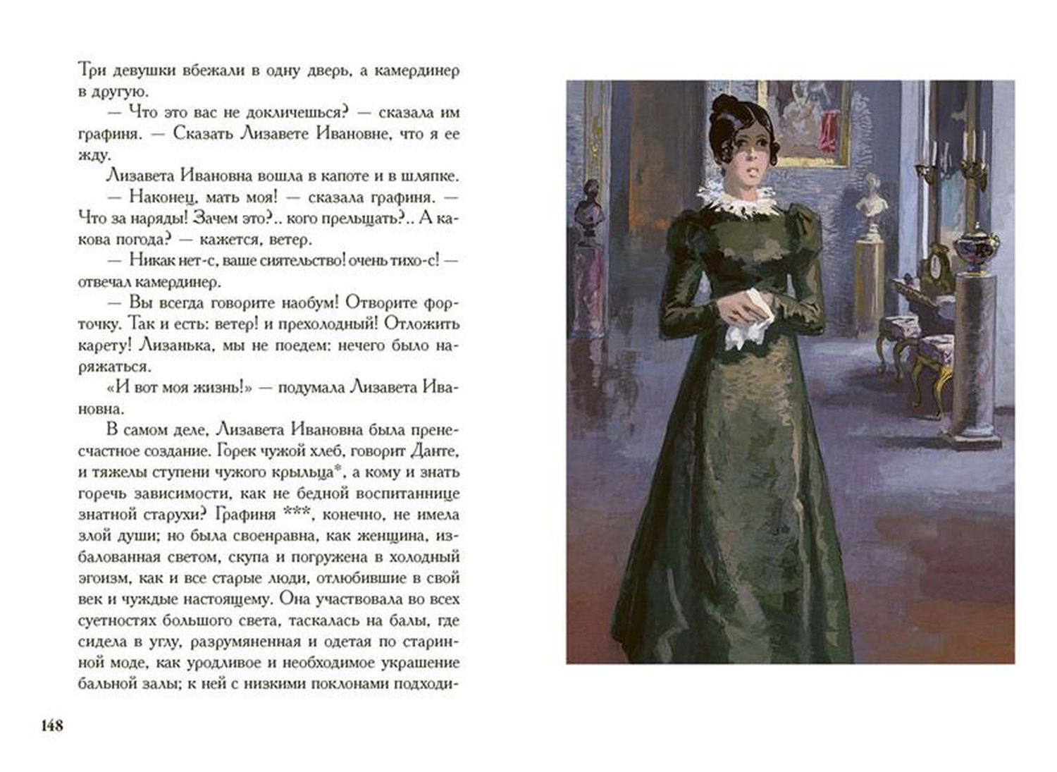 The book is accompanied by illustrations by two artists of the middle of the last century. Aram Vanetsian depicts "Tales of Belkin" as bright and colorful, allowing the reader to imagine the heroes in detail. In his illustrations, Andrei Nikolaev focuses on fate, the power of which is evident in the portraits of Hermann, Lisa and the old countess.