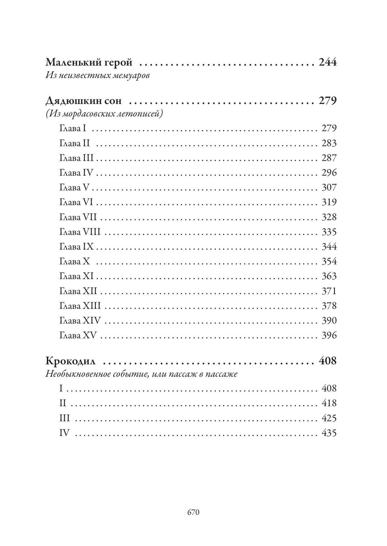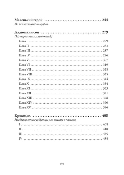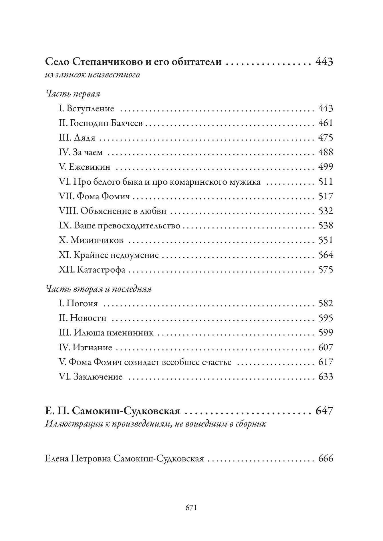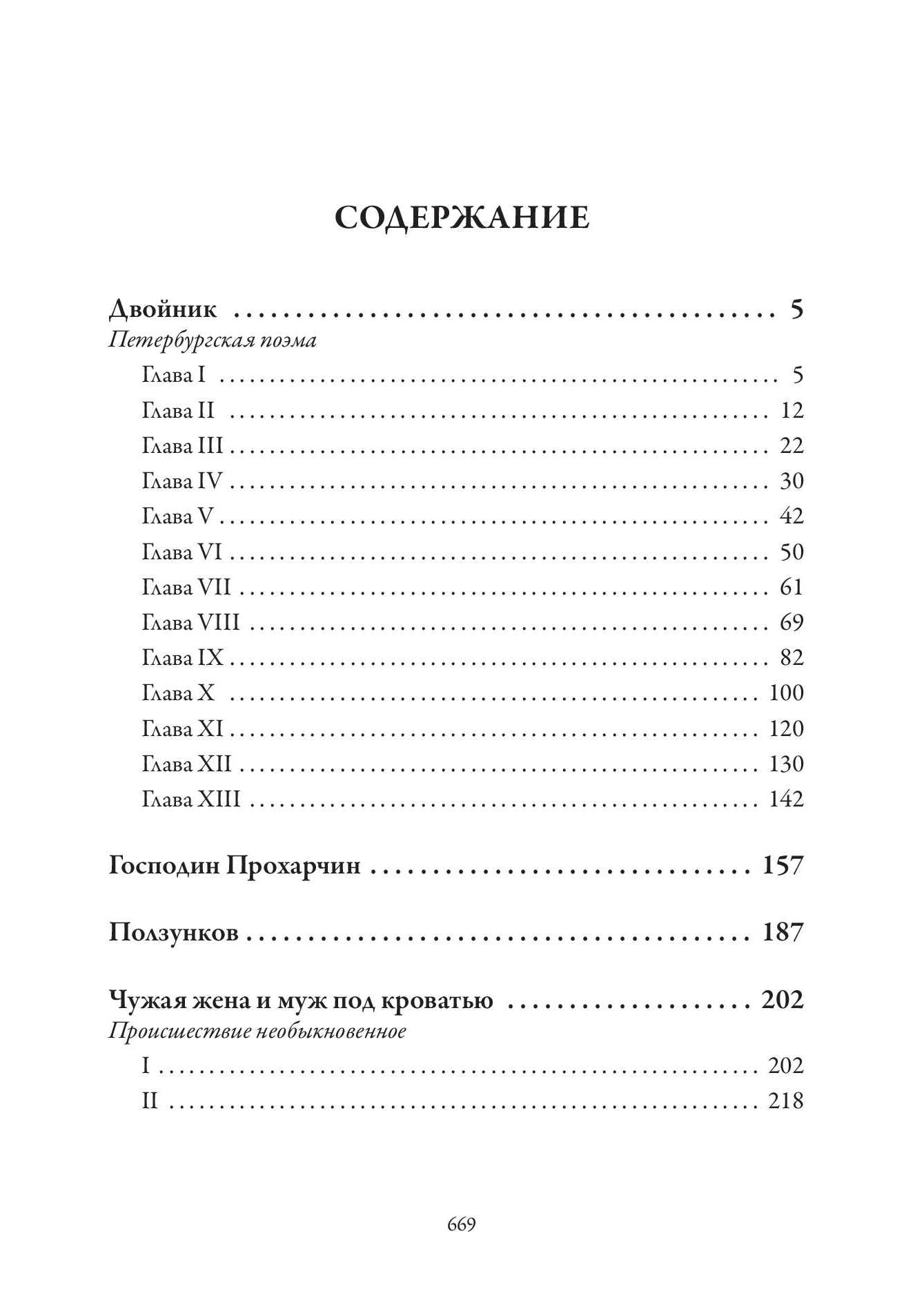 The collection includes seven novels by the world-famous Russian classicist F. M. Dostoevsky: "Dvoinik", "Mr. Proharchin", "Crawlers", "Another Man's Wife and Husband Under the Bed", "The Little Hero", "The Crocodile", and "The Village of Stepanchikovo and Its Inhabitants". At the end of the edition is an article about the life and work of Elena Petrovna Samokish-Sudkovskaya, whose drawings decorate this book, as well as her illustrations of other works by Dostoevsky, which are not included in this collection.