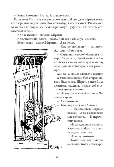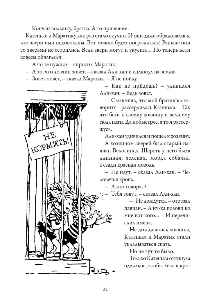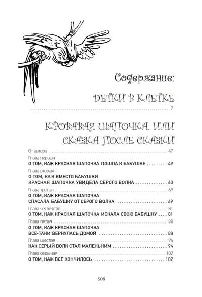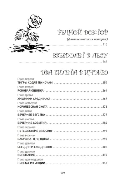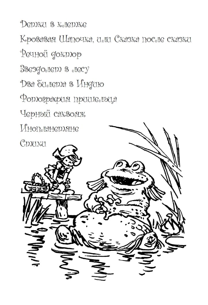 The collection of works by the famous science fiction writer Igor Vsevolodovich Mozheiko (1934-2003), who usually wrote under the pseudonym Kir Bulychev, includes eight stories and fairy tales: "Children in a Cage", "Bloody Hood, or the Tale after the Tale", "River Doctor", "Starship in the Forest", "Two Tickets to India", "Photograph of an Alien", "Black Sackbag", "Aliens", as well as ten poems. The book is decorated with drawings by the artist and innovator of Russian animation Evgeny Tikhonovich Migunov (1921-2004).