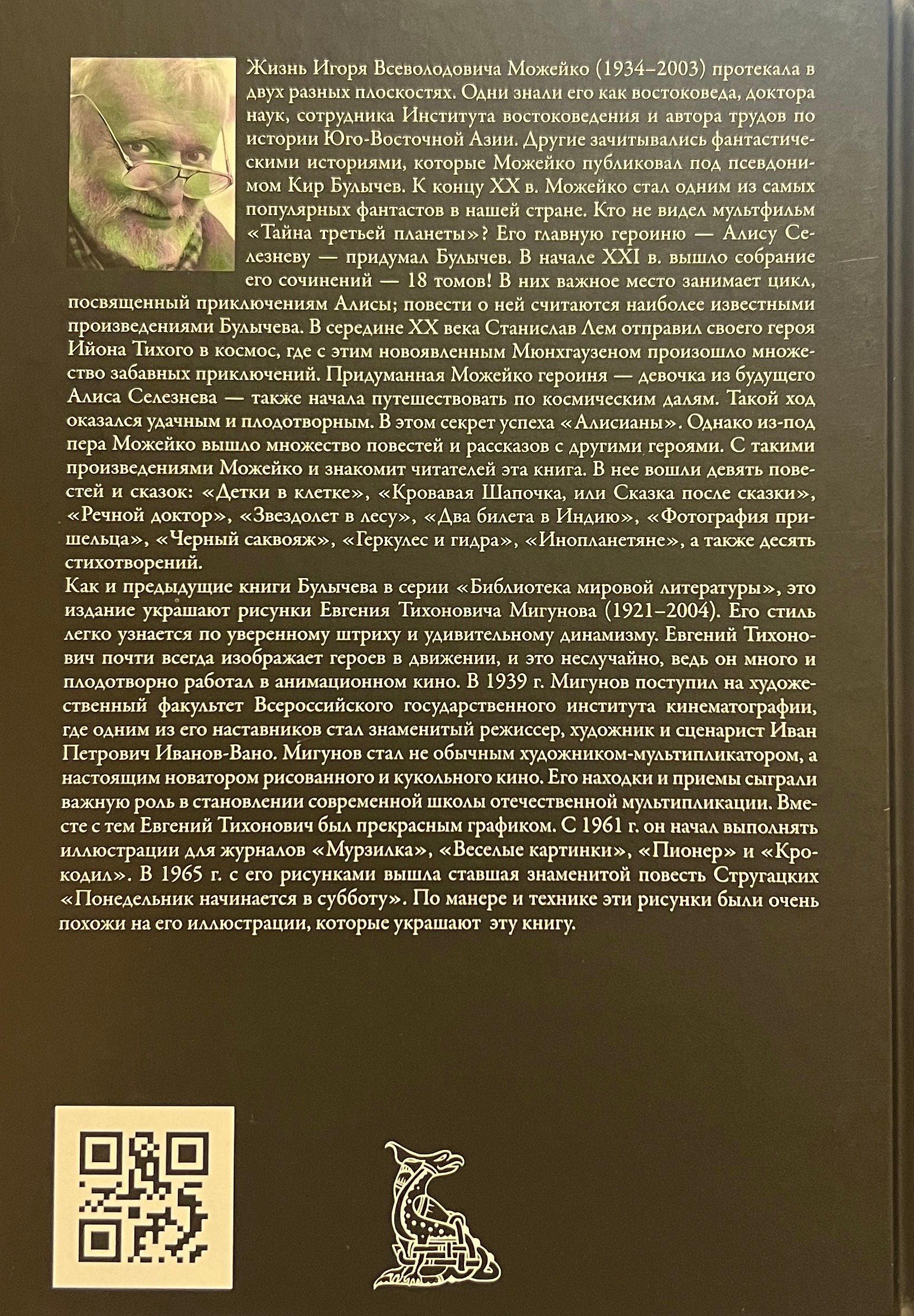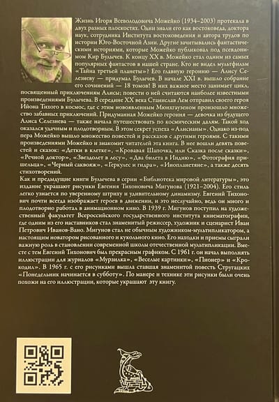 The life of Igor Vsevolodovich Mozheiko (1934-2003) was in two different planes. Some knew him as an orientalist, doctor of sciences, employee of the Institute of Oriental Studies and author of works on the history of Southeast Asia. Others read fantastic stories that Mozheiko published under the pseudonym Kir Bulychev. By the end of the twentieth century. Mozheiko became one of the most popular fiction writers in our country. Who has not seen the cartoon "The Mystery of the Third Planet"? Its main character - Alice Selezneva - was invented by Bulychev. At the beginning of the XXI century. published a collection of his works - 18 volumes! In them, an important place is occupied by a cycle devoted to the adventures of Alice; stories about her are considered the most famous works of Bulychev. In the middle of the twentieth century, Stanislav Lem sent his hero Ion Quiet into space, where many amusing adventures occurred with this newfound Munchausen. The heroine invented by Mozheiko - a girl from the future Alice Selezneva - also began to travel through space. Such a move turned out to be successful and fruitful. This is the secret of the success of "Aliciana". However, from under the pen Mozheiko came out a lot of novels and stories with other characters. With such works Mozheiko and introduces readers to this book. It includes nine novels and fairy tales: "Children in a cage", "Bloody Hood, or the Tale after the tale", "River Doctor", "Starship in the forest", "Two Tickets to India", "Photograph of an alien", "Black valise", "Hercules and the Hydra" , "Aliens", as well as ten poems. Like the previous books Bulychev in the series "Library of World Literature", this edition is decorated with drawings by Evgeny Tikhonovich Migunov (1921-2004). His style is easily recognized by his confident stroke and amazing dynamism. Eugene Tikhonovich almost always depicts characters in motion, and this is not accidental, because he worked extensively and fruitfully in animated films. In 1939 Migunov entered the art department of the All-Russian State Institute of Cinematography, where one of his mentors was the famous director, artist and screenwriter Ivan Petrovich Ivanov-Vano. Migunov became not an ordinary animator, but a real innovator of drawn and puppet movies. His findings and techniques played an important role in the formation of the modern school of Russian animation. At the same time Yevgeny Tikhonovich was an excellent graphic artist. Since 1961 he began to do illustrations for the magazines "Murzilka", "Veselye Kartinki", "Pioner" and "Krokodil". In 1965 his drawings were used to illustrate the famous Strugatsky novel "Monday Begins on Saturday". In manner and technique, these drawings were very similar to his illustrations, which decorate this book.