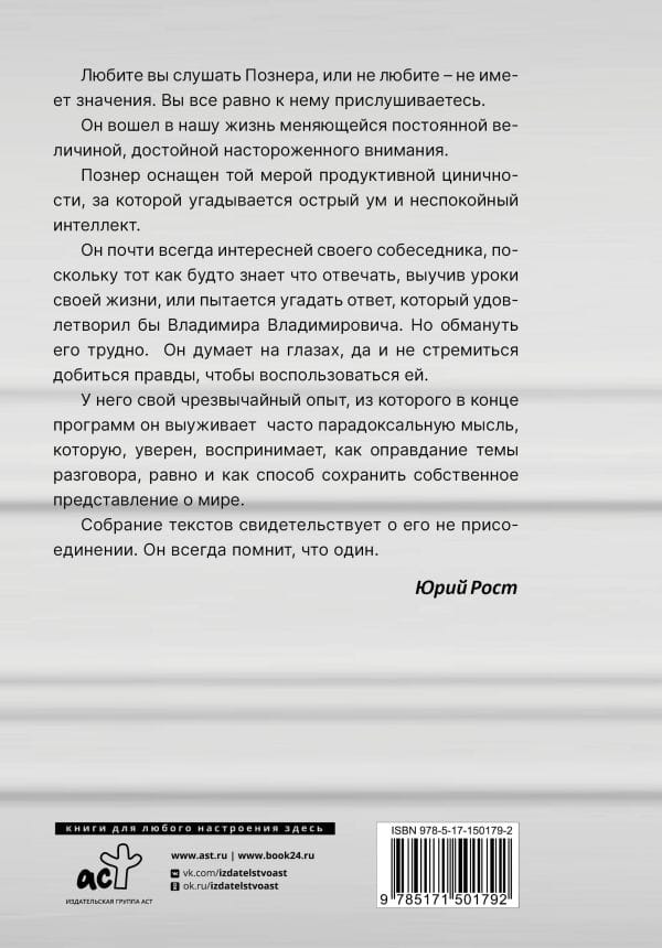 Vladimir Vladimirovich Pozner is a maestro of Russian journalism. He has years of productive work on television (as the host of the author's TV interview program "Posner" on Channel One) and several books under his belt. His book "Farewell to Illusions" was on the New York Times bestseller list for several months. Vladimir Posner's new book "A Cause for Optimism? Farewells" begs the question. Posner reflects on the most pressing issues of our time, covering them from a different angle and emphasizing the connection with current events. The author refers to the past, sketches possible scenarios for the future, ironically sharpening urgent problems and forcing the reader to search for a solution on his own and conclude whether we have a reason for optimism.