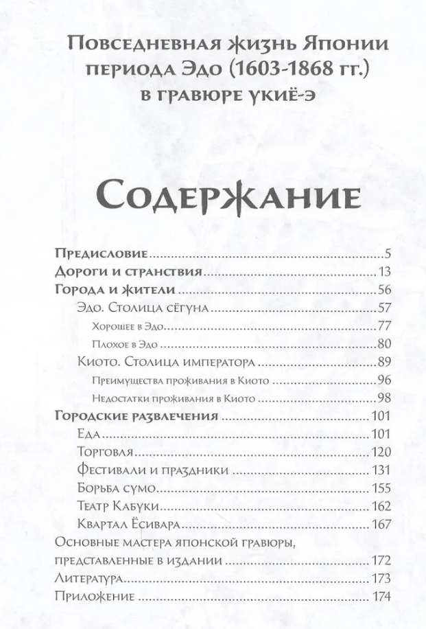 This book is dedicated to everyday life in Japan as depicted in traditional ukiyo-e woodblock prints. Urban planning, trade and entertainment, religious festivals and holidays, food and education—the publication explores various aspects of Japanese society. These prints offer insights into the structure of Japan's largest cities, the everyday living conditions of the Japanese people, entertainment, and, in general, into the things and phenomena that were common and taken for granted by urban dwellers. The prints were created by renowned artists of the Edo period.