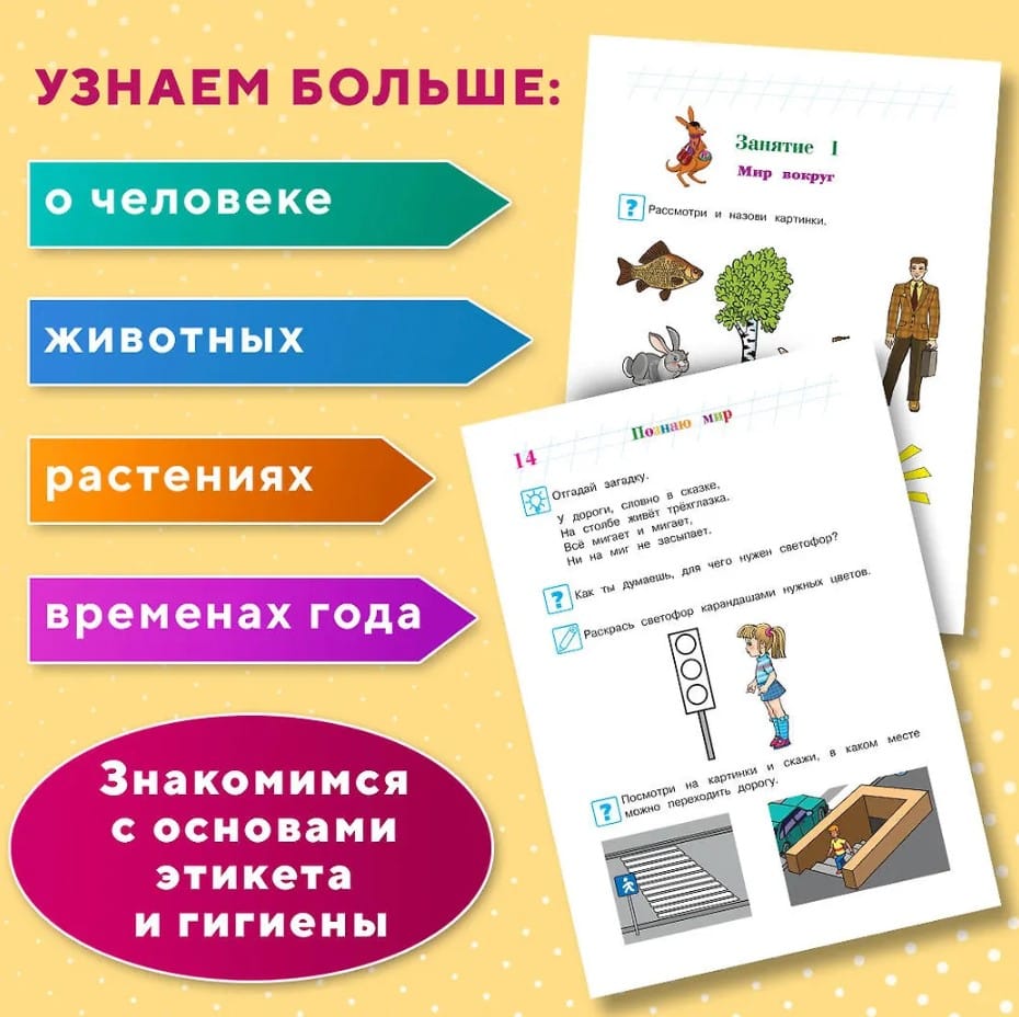 The legendary series of educational resources for child development and school preparation now features a new design! This proven methodology, skillfully combining modern teaching technologies with the best classical traditions of Russian education, will help adults give preschoolers a basic understanding of the world around them (objects, living and nonliving nature, and humans), broadening their horizons and vocabulary.
