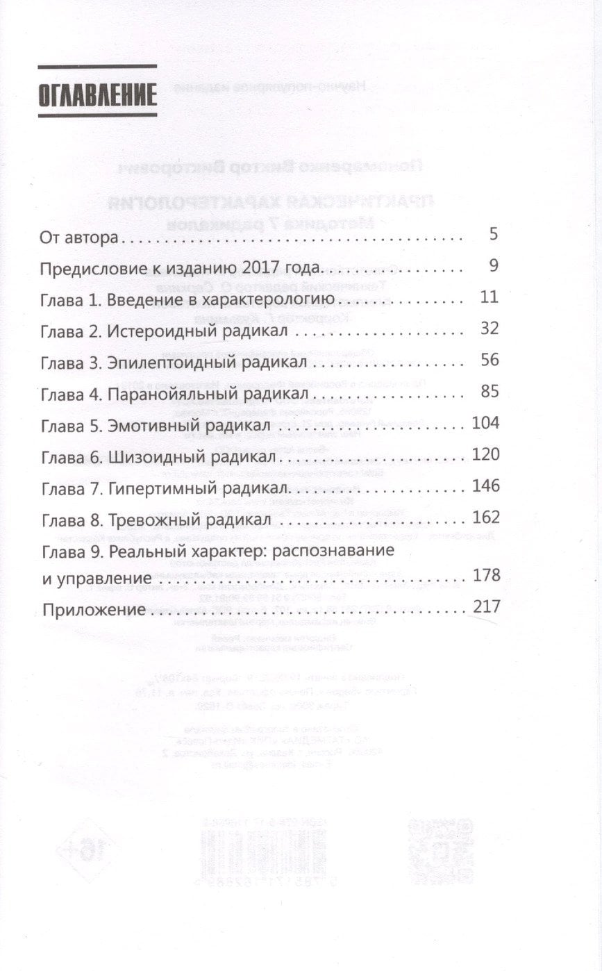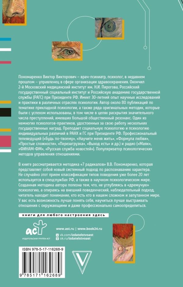 The book deals with the methodology of "7 radicals" V.V. Ponomarenko. Ponomarenko, which is a new systematic approach to character recognition. It is no coincidence that this method of classifying types of behavior has been used for more than 20 years in the special services of the Russian Federation, as well as in the scientific psychological world. The author's methodology is useful in that, without delving into the "dormant" psychology, but based on an external behavioral, observational approach, the reader finds an understanding of who is who in our complex and confusing world. You have the opportunity to better understand yourself, learn how to better build relationships with others, and even professionally self-determine.