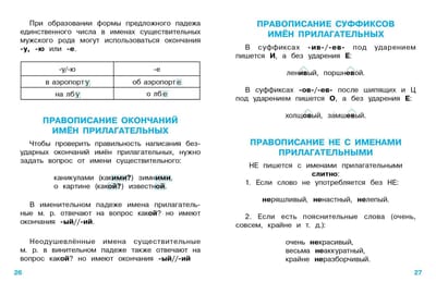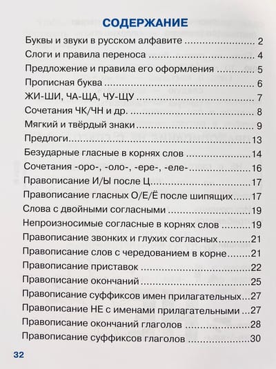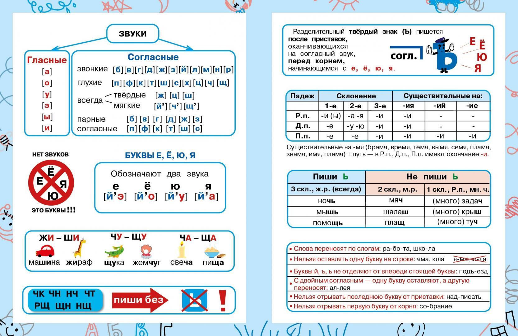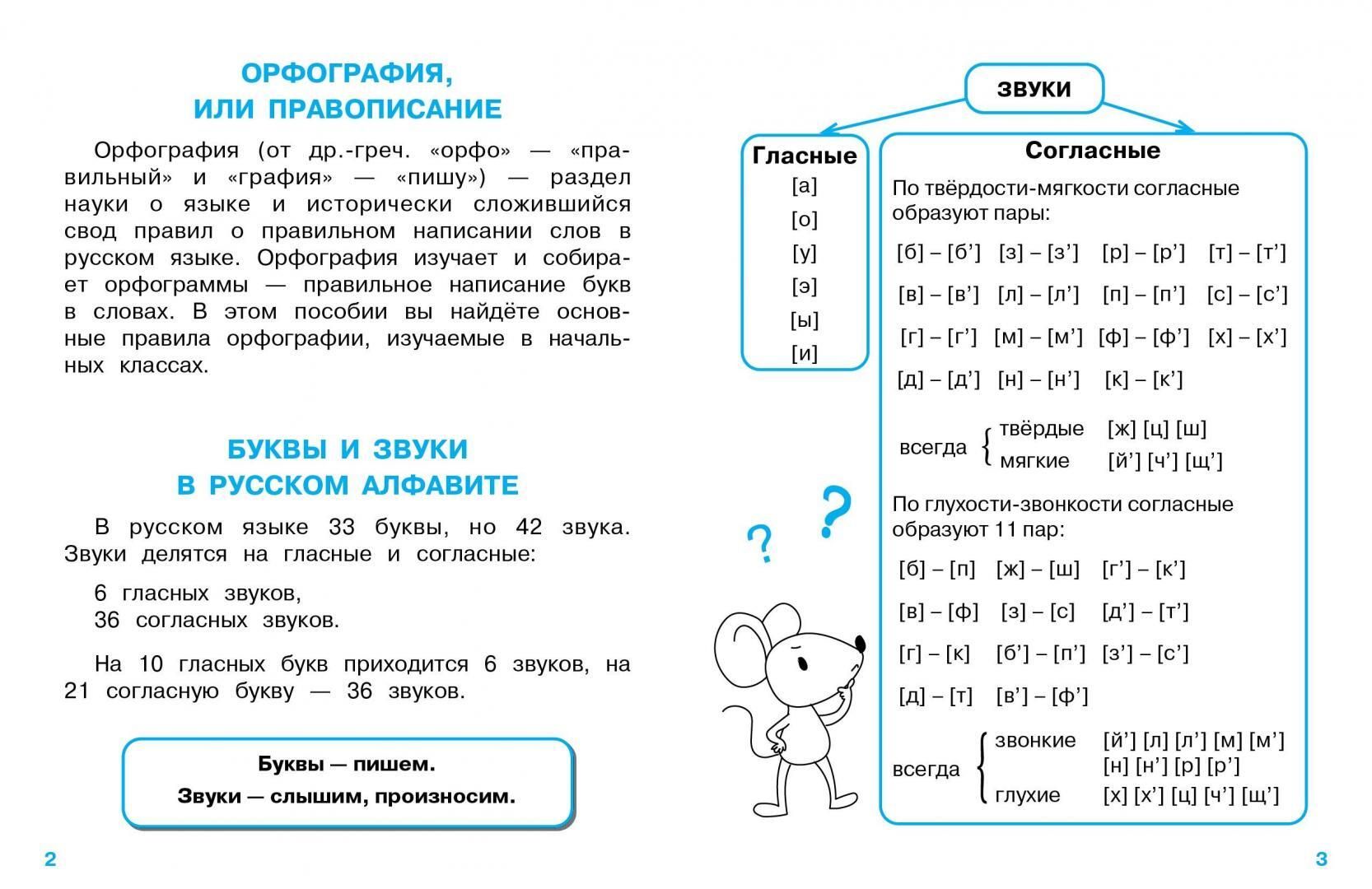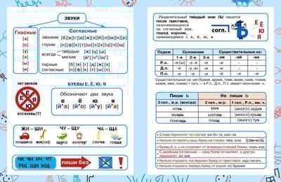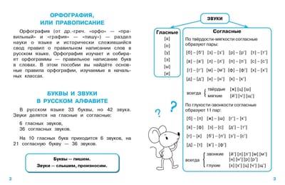 The manual contains the basic rules of spelling that an elementary school graduate should know, and everything you need to remember in Russian language class and when preparing homework. On the sheet with stickers you will find the most important ones. The child can stick these cheat sheets on the inside cover of a notebook, textbook or just in a prominent place at home to learn the rule faster. The manual is designed for use at school and at home.