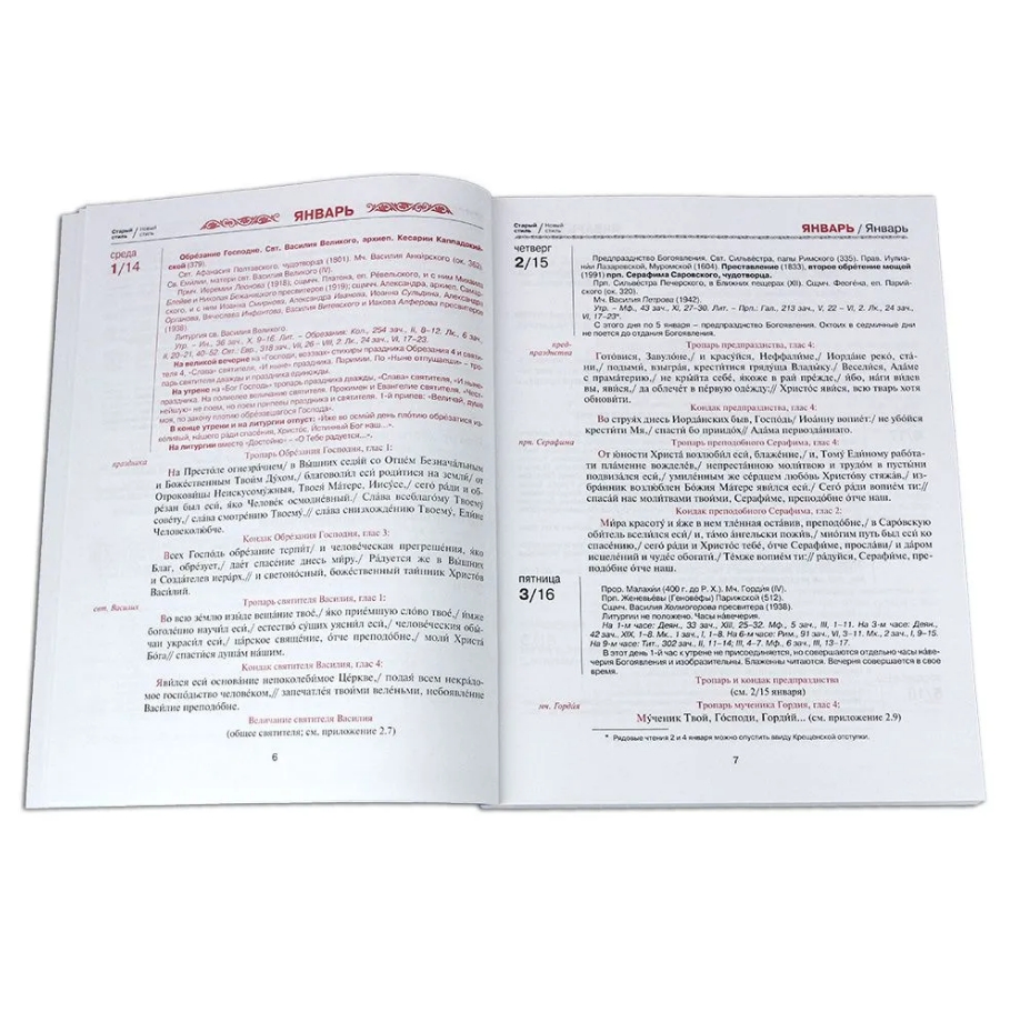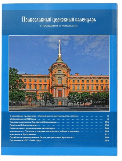 The calendar includes a complete menology with complete liturgical notes, taking into account the necessary transfers of celebrations in 2026, and contains directions for the daily readings from Holy Scripture recited in churches during services. The reference section of the calendar includes a list of church holidays and commemorations, instructions on fasts and meals, a list of days of special commemoration of the dead, and more.
