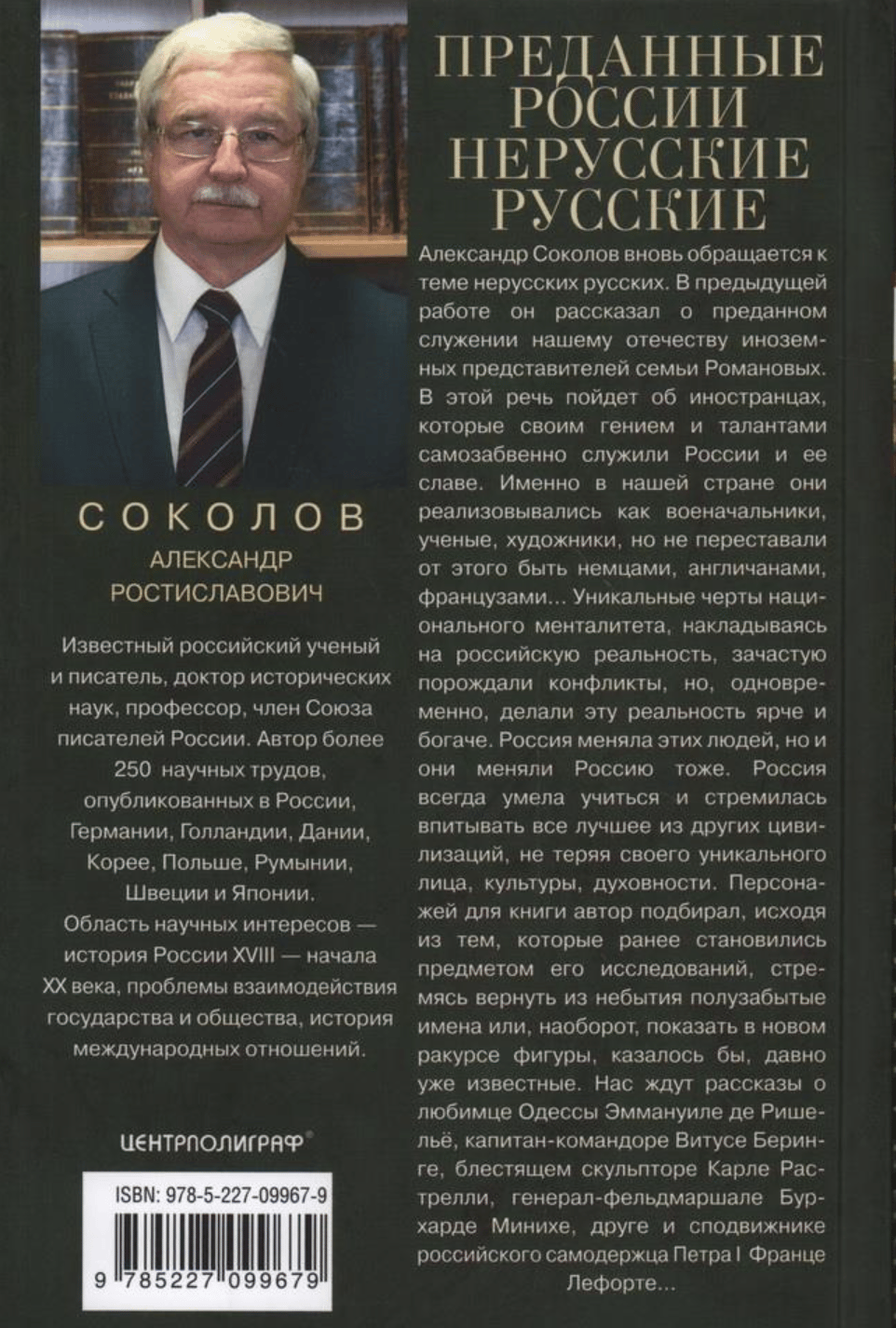 Alexander Sokolov once again addresses the topic of non-Russians. In his previous work, he described the devoted service to our fatherland of the foreign members of the Romanov family. In this one, he will focus on foreigners who, with their genius and talents, selflessly served Russia and its glory. It was in our country that they realized their potential as military leaders, scientists, and artists, but they never ceased to be Germans, Englishmen, and Frenchmen. Unique features of the national mentality, overlapping with Russian reality, often generated conflicts, but at the same time, they made that reality brighter and richer. Russia changed these people, but they changed Russia too. Russia has always been able to learn and has strived to absorb the best from other civilizations without losing its unique identity, culture, and spirituality. The author selected the characters for the book based on themes he had previously researched, seeking to bring half-forgotten names back from obscurity or, conversely, to reveal seemingly well-known figures in a new light. We'll read stories about Odessa's beloved Emmanuel de Richelieu, Captain-Commander Vitus Bering, the brilliant sculptor Carlo Rastrelli, Field Marshal Burkhard Munnich, and Franz Lefort, friend and associate of the Russian Tsar Peter the Great.