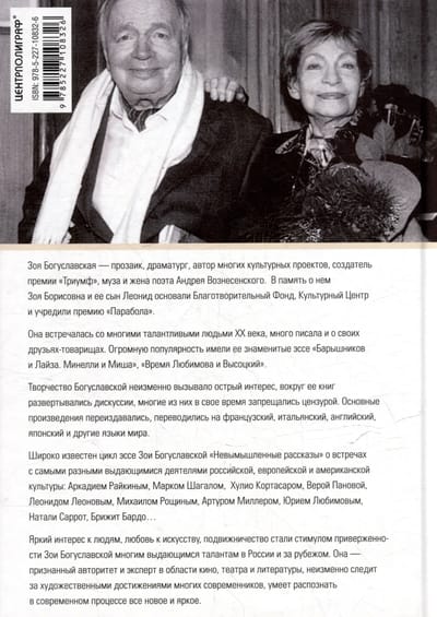 Zoya Boguslavskaya is a prose writer, playwright, author of many cultural projects, creator of the Triumph Prize, and muse of the poet Andrei Voznesensky. She met many talented people of the century and wrote a lot about her friends and comrades. Her famous essays "Baryshnikov and Liza. Minnelli and Misha", "The Time of Lyubimov and Vysotsky", and her memories of meetings with Marc Chagall, Brigitte Bardot, Arkady Raikin and many others were extremely popular.