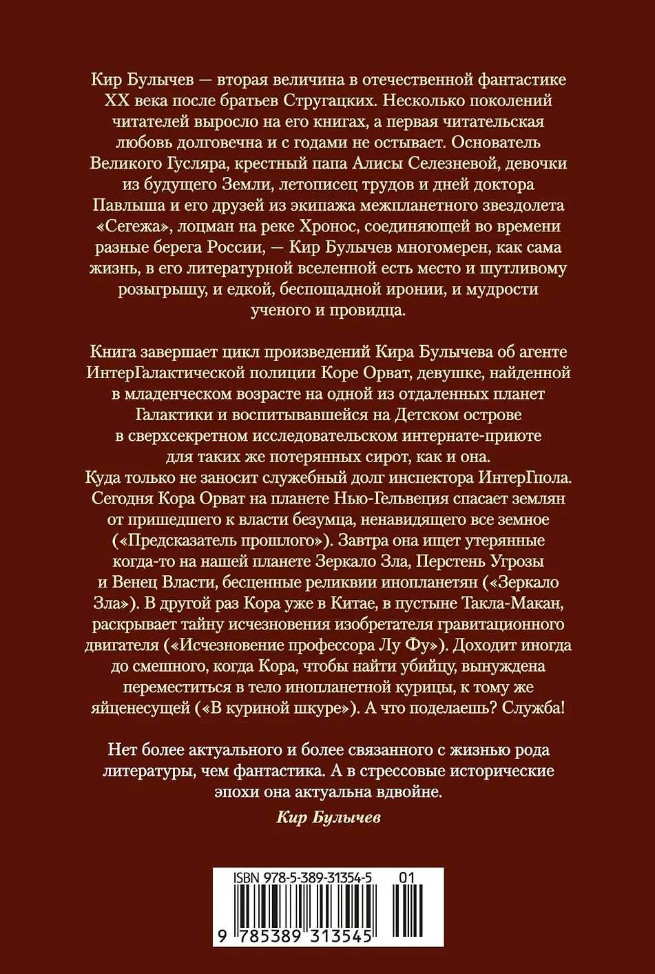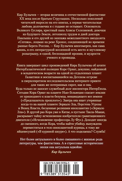 Kir Bulychev is the second-largest figure in 20th-century Russian science fiction after the Strugatsky brothers. Several generations of readers grew up on his books, and his initial love is enduring and never fades with the years. The founder of the Great Guslar, the godfather of Alisa Selezneva, a girl from Earth's future, the chronicler of the works and days of Doctor Pavlysh and his friends from the crew of the interplanetary starship Segezha, the pilot on the Chronos River, which connects the different banks of Russia in time—Kir Bulychev is as multidimensional as life itself. His literary universe contains playful pranks, caustic, merciless irony, and the wisdom of a scientist and visionary.