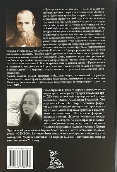"Crime and Punishment" is one of the most famous, integral and profound works of Dostoevsky. The text of this drama was first published in a magazine version in 1866, and a year later came out as a separate book. Curiously, the novel immediately attracted the attention not only of the entire Russian reading public, but also of foreign criminalists, who admired the subtle analysis of the psychology of the criminal described in this work. To put it in modern terms, Dostoevsky, with the help of the artist's amazingly subtle flair, studies in him the innate programs of behavior, which support only very weak barriers that keep a person from criminal actions. And yet these barriers are real, their quiet voice we call conscience. Like Dante, Dostoevsky together with his characters descends into the hell of dark movements of the human soul, but he behaves not as an impartial researcher, but as a Christian, ready to understand and accept the torments of his characters. This is one of the reasons for the success of Crime and Punishment, for Dostoevsky speaks to his readers in a heartfelt way about the most important thing in this novel - the moral foundations of the individual, whether they are real or artificial. This edition of the novel completes a short essay on Dostoevsky's work. Its author Akim Lvovich Volynsky (literary pseudonym of Chaim Flexler) was a prominent Russian art historian and literary critic of the late 19th century. The illustrations to the novel, which well convey both the urban atmosphere of St. Petersburg in the last third of the 19th century and the complex world of the characters in the drama, were made by Olga Andreyevna Rusakova. She was born in St. Petersburg, graduated from the Faculty of Design of the Finnish University of Applied Sciences Kymenlaakso and interned at the Polytechnic University of Valencia, Faculty of Fine Arts. She has participated in international illustration and wall art competitions. She participated in the design of the editions of "Alice in Wonderland" and "The Adventures of Baron Munchausen", published by the publishing house "SZKEO". She also made illustrations for Marina Tsvetaeva's collection of poems "Evening Album", published by the same publishing house in 2018.
