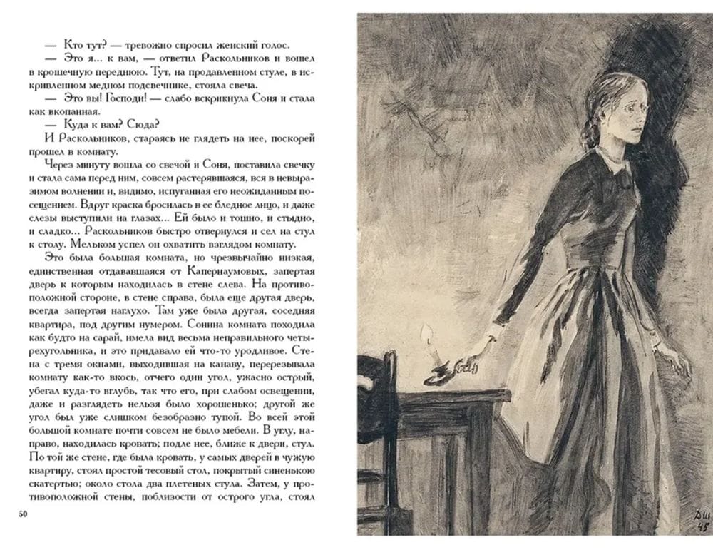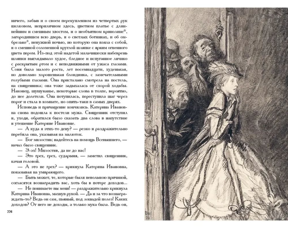 The novel "Crime and Punishment" - an example of psychological and socio-philosophical prose. The protagonist - student Rodion Raskolnikov plots murder and robbery. His motives, on the one hand, are clear: he is poor and in dire need of money; on the other hand, it is not the thirst for enrichment that drives him, but the thought of the chosenness and superiority of some people over others. Whether it is possible to internally justify the crime and what punishment awaits the one who dares to violate social and moral laws - these questions create the drama of the novel and keep the reader in suspense until the finale. Expressive illustrations for the novel were created by the artist Dementy Shmarinov, a master of conveying the most complex psychological characteristics of the characters.