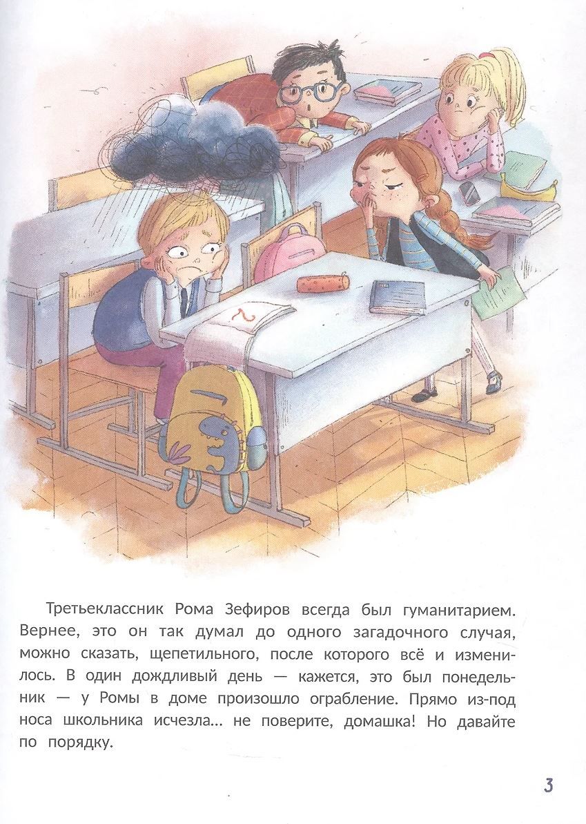 One rainy day, Roma Zefirov, a student of the 3rd "B" class of school No. 7, was robbed in the house. Right from under the nose of the schoolboy disappeared... believe it or not, his math homework! To find the kidnapper in order to correct an undeserved bad grade, his friend Mashka, who knows how to take fingerprints and interrogate suspects, will help him.