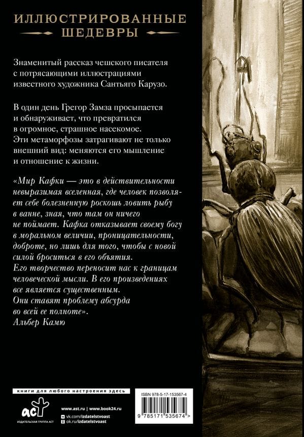 A famous story by the Czech writer with stunning illustrations by the famous artist Santiago Caruso.One day Gregor Zamza wakes up and discovers that he has turned into a huge, terrifying insect. This metamorphosis affects more than just his appearance: his thinking and attitude to life change.