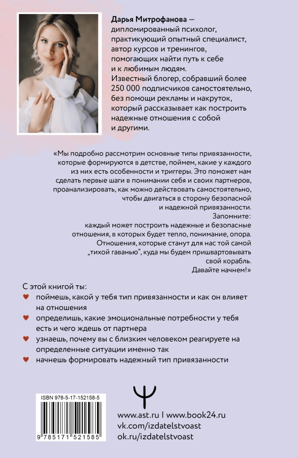 You will find out with the help of attachment theory! The author, experienced psychologist Daria Mitrofanova, consistently explains what an attachment type is, how it is formed in childhood, affects our adult life and how to change it in order to be in harmony with yourself and your partner.